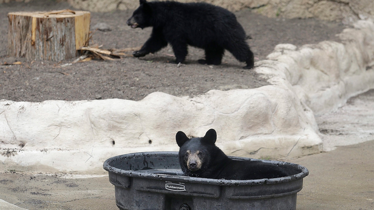 ลูกหมีควาย หรือหมีดำ (black bear) 2 ตัวกำลังอยู่ในอิริยาบถที่แตกต่างกัน เจ้าหมีตัวผู้กำลังนั่งนิ่งๆอยู่ในอ่างอาบน้ำ ขณะที่หมีตัวเมียกำลังเดินอยู่ด้านหลังไกลออกไป หมีควายทั้งคู่ยังไม่มีชื่อเป็นของตัวเอง นับตั้งแต่ถูกค้นพบว่ามันระเหเร่ร่อนอยู่ห่างจากรัฐอลาสกาประมาณ 160 กิโลเมตร และมีสภาพผอมโซเนื่องจากถูกแม่หมีทิ้งไป แต่ตอนนี้ลูกหมีอ้วนท้วนสมบูรณ์ดี โดยอาศัยอยู่ในสวนสัตว์ซานฟรานซิสโก รัฐแคลิฟอร์เนีย ประเทศสหรัฐอเมริกา.