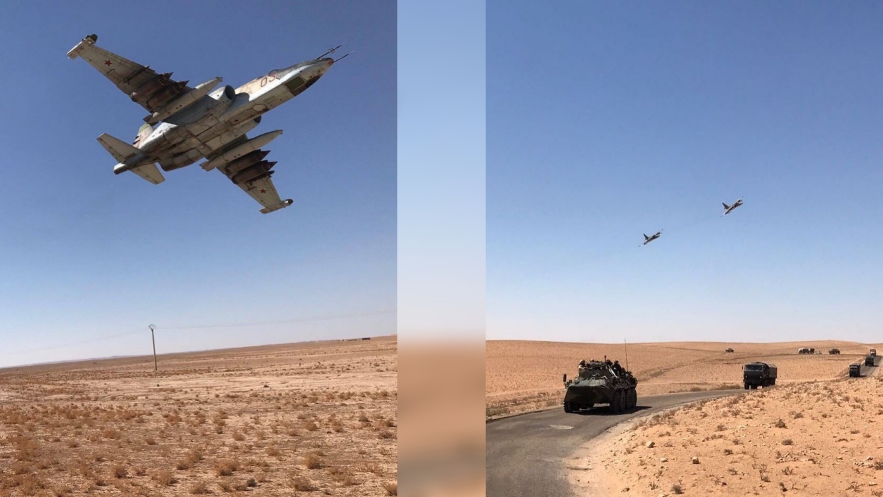 เครื่องบินโจมตีแบบ ซู-25 เอสเอ็ม ฟร็อกฟุต ของกองทัพรัสเซีย บินโฉบในระดับต่ำ เพื่อคุ้มกันกองทหาร และขบวนยานเกราะ ขณะเคลื่อนเข้าไปยังเมือง DeirEzzor ของซีเรีย...