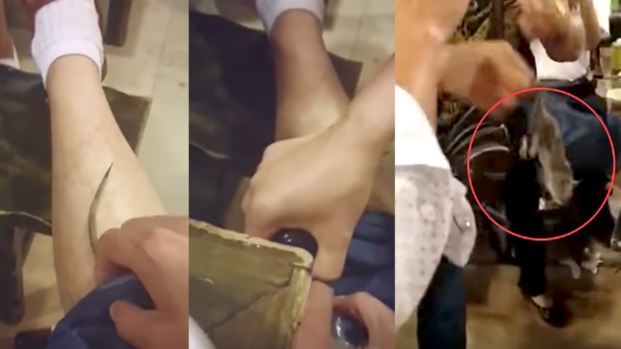 อั้ยหยา.. ลูกค้าชายเคราะห์ร้าย เจอหนูวิ่งมุดเข้ามาในขากางเกง ขณะอยู่ในร้านฮอตพอต แห่งหนึ่งที่เมืองฉงชิ่ง เดชะบุญ จับหนูไม่ให้วิ่งเข้าไปลึกกว่านั้นได้ทัน และดึงมันออกมาจากขากางเกง ยกโชว์กลางร้าน