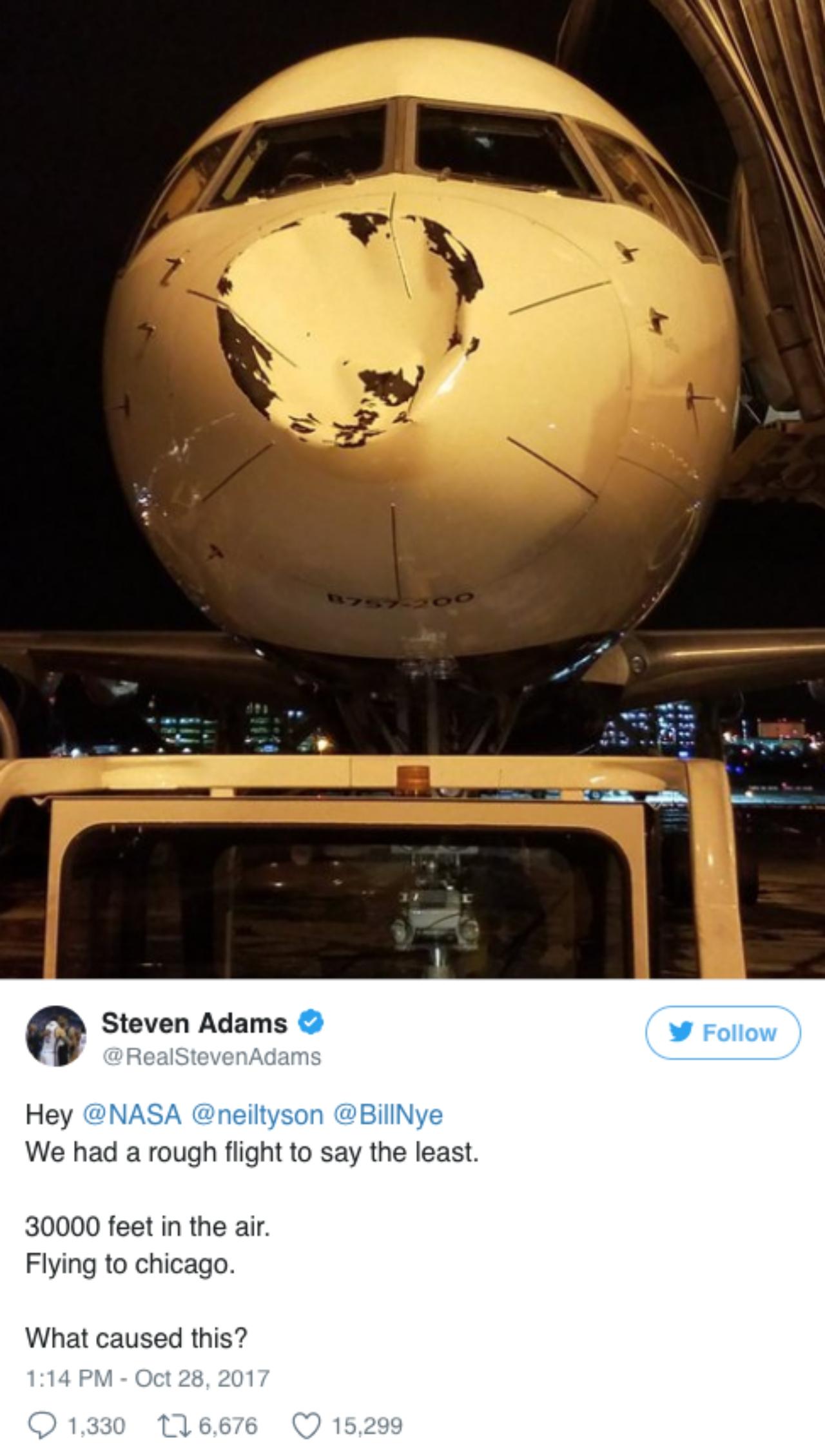 สตีเว่น อดัมส์ นักบาสเอ็นบีเอชื่อดัง ทีมโอกลาโฮมา ซิตี้ ธันเดอร์ ได้แชร์ภาพเหตุการณ์ระทึกคราวนี้ลงในทวิตเตอร์ พร้อมข้อความว่า ‘สวัสดี นาซา, @Bill Nye และ @Neil Tyson (นักวิทยาศาสตร์ชื่อดัง) พวกเรามีเที่ยวบินไม่ราบรื่นที่จะขอออกความเห็นให้น้อยที่สุด’ ขณะบินอยู่ที่ความสูง 30,000 ฟุต มาชิคาโก.. อะไรที่สามารถทำให้จมูกเครื่องบินได้รับความเสียหายขนาดนี้?’