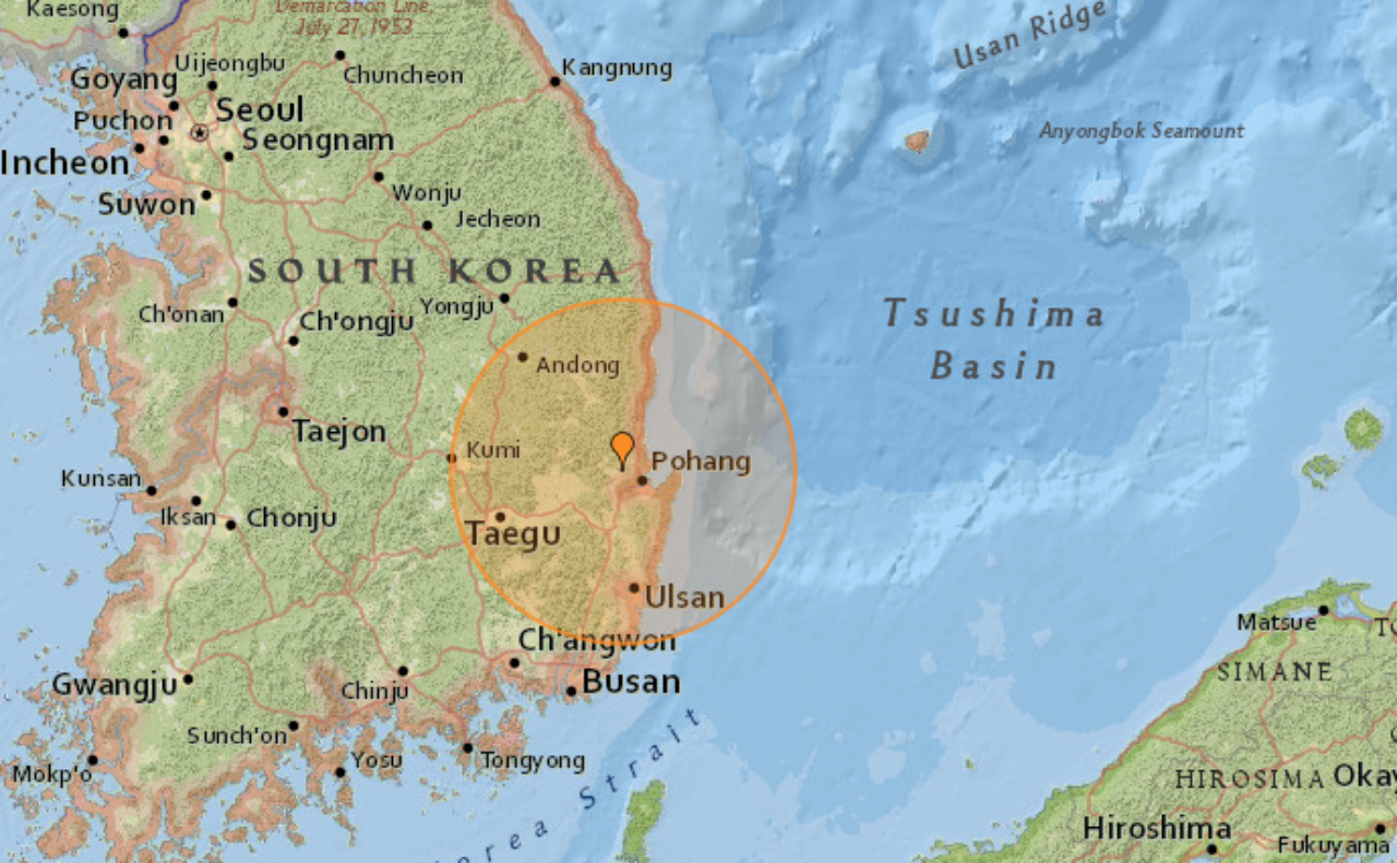 เมื่อ 15 พ.ย. 60 สำนักข่าวต่างประเทศรายงานเกิดเหตุแผ่นดินไหว ขนาด 5.4 เขย่าพื้นที่ชายฝั่งทะเลทางภาคตะวันออกเฉียงใต้ของประเทศเกาหลีใต้ เมื่อเวลาประมาณ 14.29 น. ของบ่ายวันที่ 15 พ.ย.ตามเวลาท้องถิ่น โดยตามรายงานของสำนักสำรวจทางธรณีวิทยาสหรัฐฯ ระบุ ศูนย์กลางแผ่นดินไหวอยู่ห่างจากเมืองโพฮัง ซึ่งเป็นเมืองท่องเที่ยวชายทะเล ไปทางเหนือประมาณ 6 กิโลเมตรและอยู่ลึกจากผิวดิน 10 กิโลเมตร ขณะที่ แรงสั่นสะเทือนของแผ่นดินไหวรู้สึกได้ไกลถึงกรุงโซล เมืองหลวง ซึ่งอยู่ห่างจากศูนย์กลางแผ่นดินไหว กว่า 300 กิโลเมตร