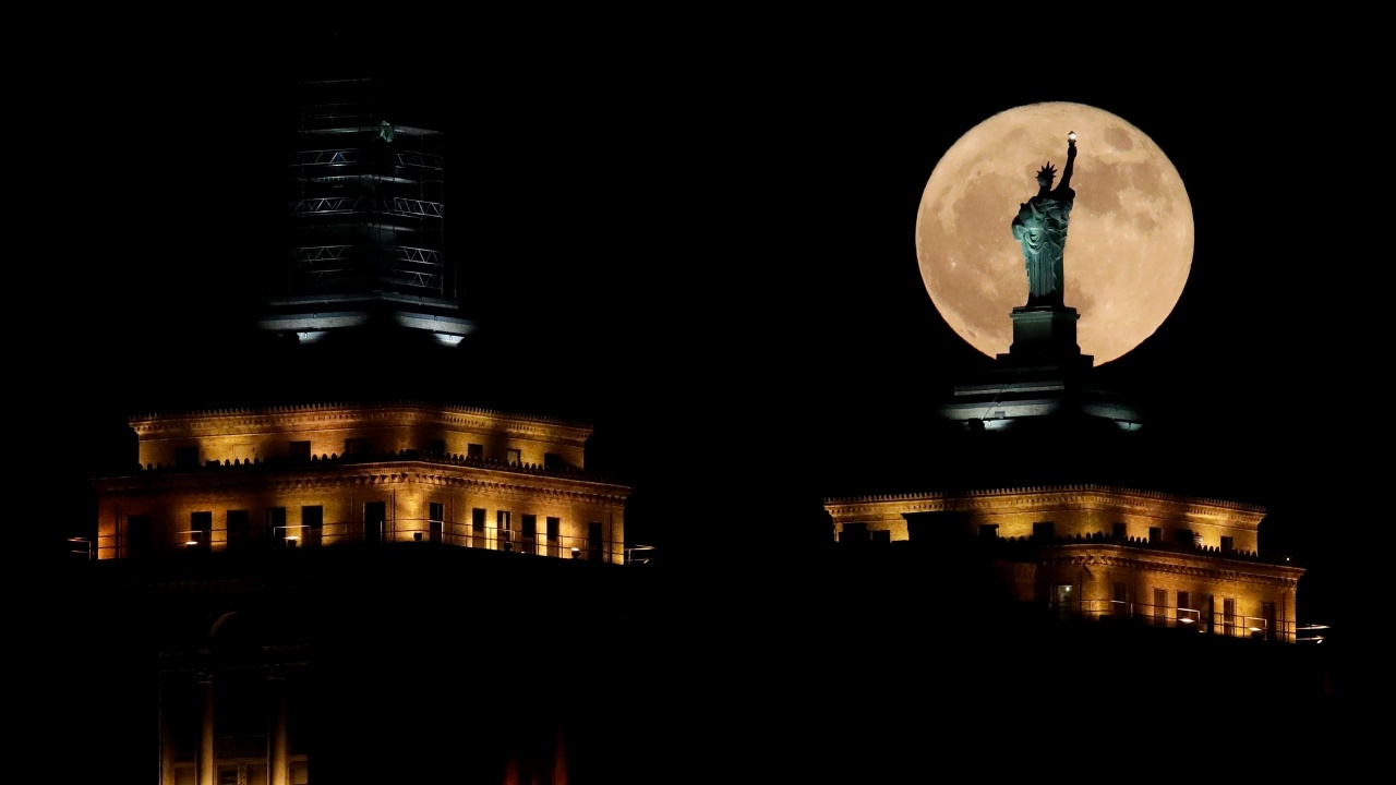 ซุปเปอร์มูนลอยอยู่ด้านหลังของเทพีเสรีภาพจำลอง เหนืออาคารเสรีภาพในเมืองบัฟฟาโล รัฐนิวยอร์ก