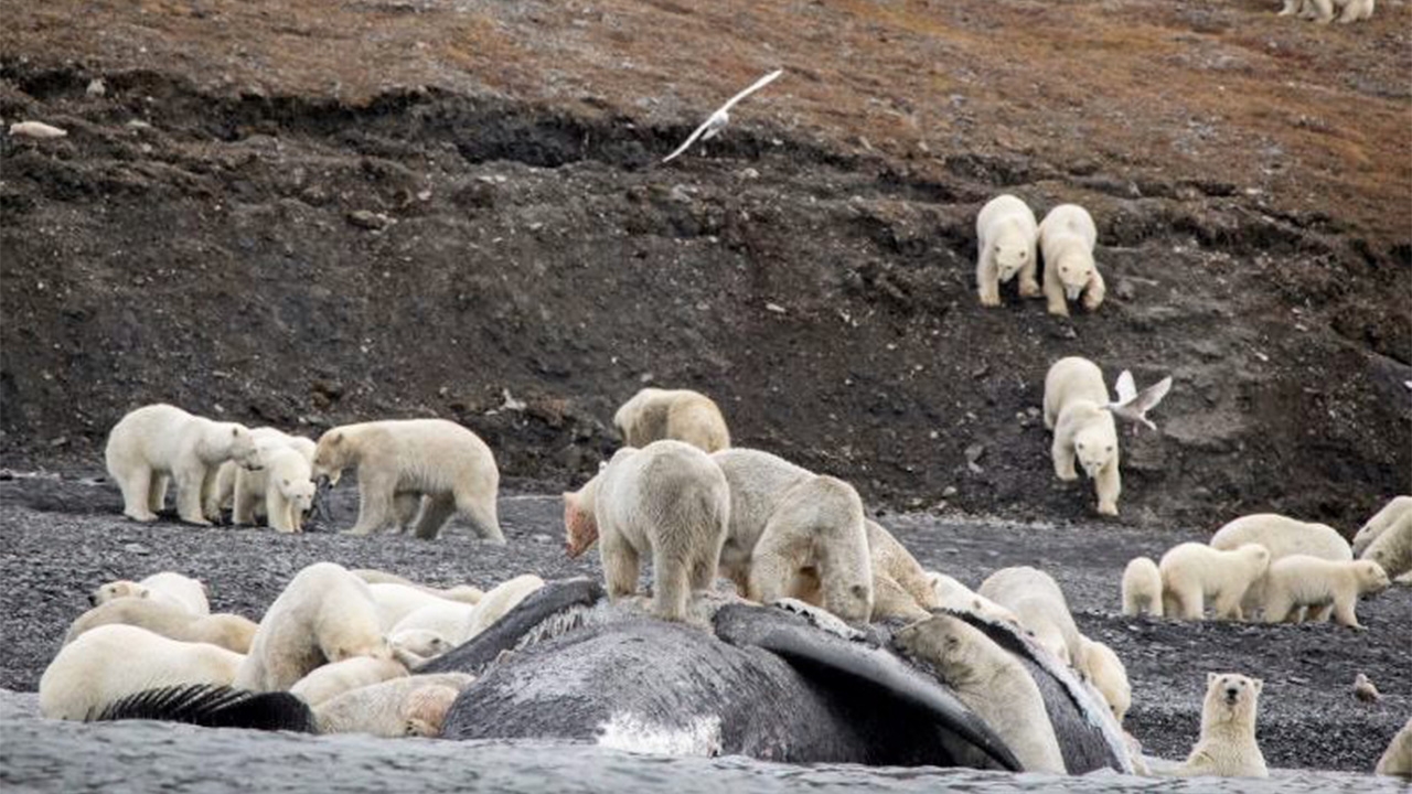 ภาพที่ชวนให้นักท่องเที่ยวบนเรือนำเที่ยวต้องตื่นเต้นขณะล่อง ไปถึงฝั่งตะวันออกของขั้วโลกเหนือ หรือแถบอาร์กติกฝั่งรัสเซีย นั่นคือฝูงหมีขั้วโลกกำลังรุมแทะซากปลาวาฬอย่างเอร็ดอร่อย โดยรอบนั้นก็มีเหล่าครอบครัวของหมีขั้วโลกพักอาศัยอยู่ใกล้ๆ ซึ่งนายอเล็กซานเดอร์ กรูซเดฟ ผู้อำนวยการเขตอนุรักษ์ธรรมชาติของเกาะแรงเกิล เผยว่า นี่เป็นสถานการณ์เฉพาะที่ไม่เหมือนใคร