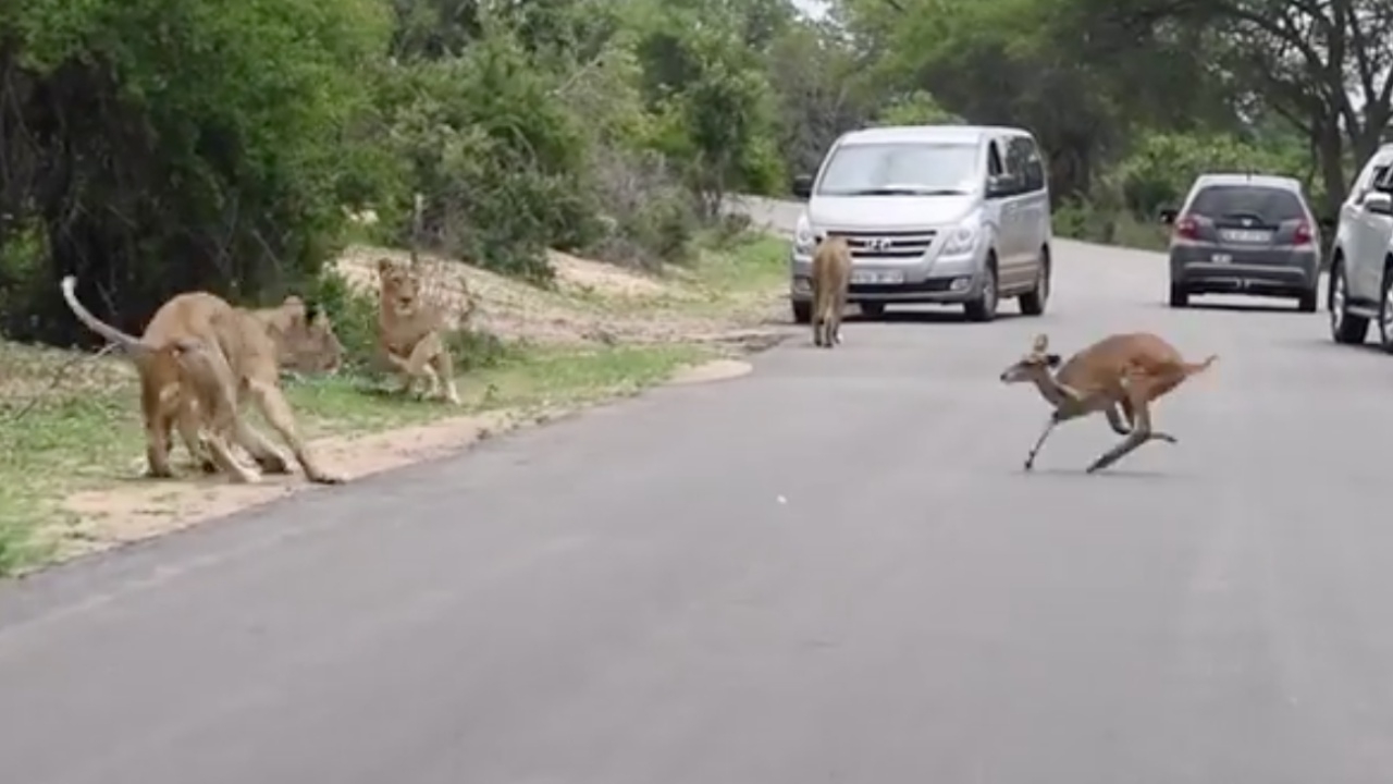 กวางหนุ่มตัวหนึ่งที่อุทยานแห่งชาติในแอฟริกาใต้ชะตาถึงฆาต เมื่อมันพุ่งเข้าใส่ฝูงสิงโตที่กำลังเดินอยู่ข้างถนนด้วยความเร็วสูง เพียงเพื่อกลายเป็นอาหารมื้ออร่อยเหล่าเจ้าป่าเท่านั้น...