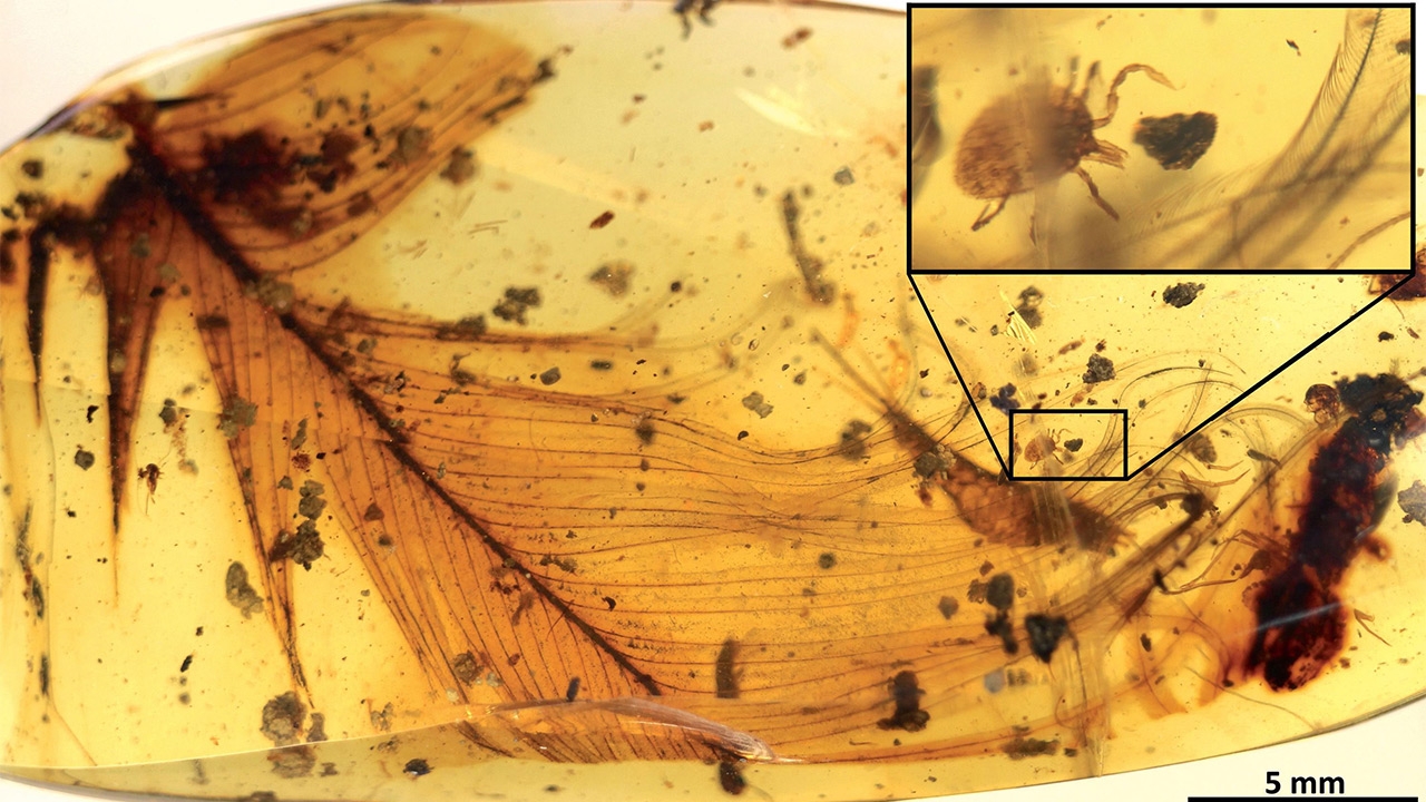 บทความใหม่ที่เพิ่งตีพิมพ์ในวารสารธรรมชาติโดยนักบรรพชีวินวิทยาจากพิพิธภัณฑ์ประวัติศาสตร์ธรรมชาติแห่งมหาวิทยาลัยออกซ์ฟอร์ด รายงานการพบซากดึกดำบรรพ์หรือฟอสซิลปรสิตไดโนเสาร์ที่มีลักษณะคล้ายแมลงหรือเห็บตัวเล็กๆ ถูกขังตายอยู่ในก้อนอำพันอายุ 99 ล้านปี พร้อมกับซากฟอสซิลหางของไดโนเสาร์ชนิดมีขนเหมือนนก ที่มีชีวิตอยู่ในยุคครีเทเชียส ซึ่งก้อนอำพันนี้พบในประเทศพม่า และเป็นไปได้ว่าเห็บตัวดังกล่าวเคยดูดเลือดของไดโนเสาร์ตัวนี้