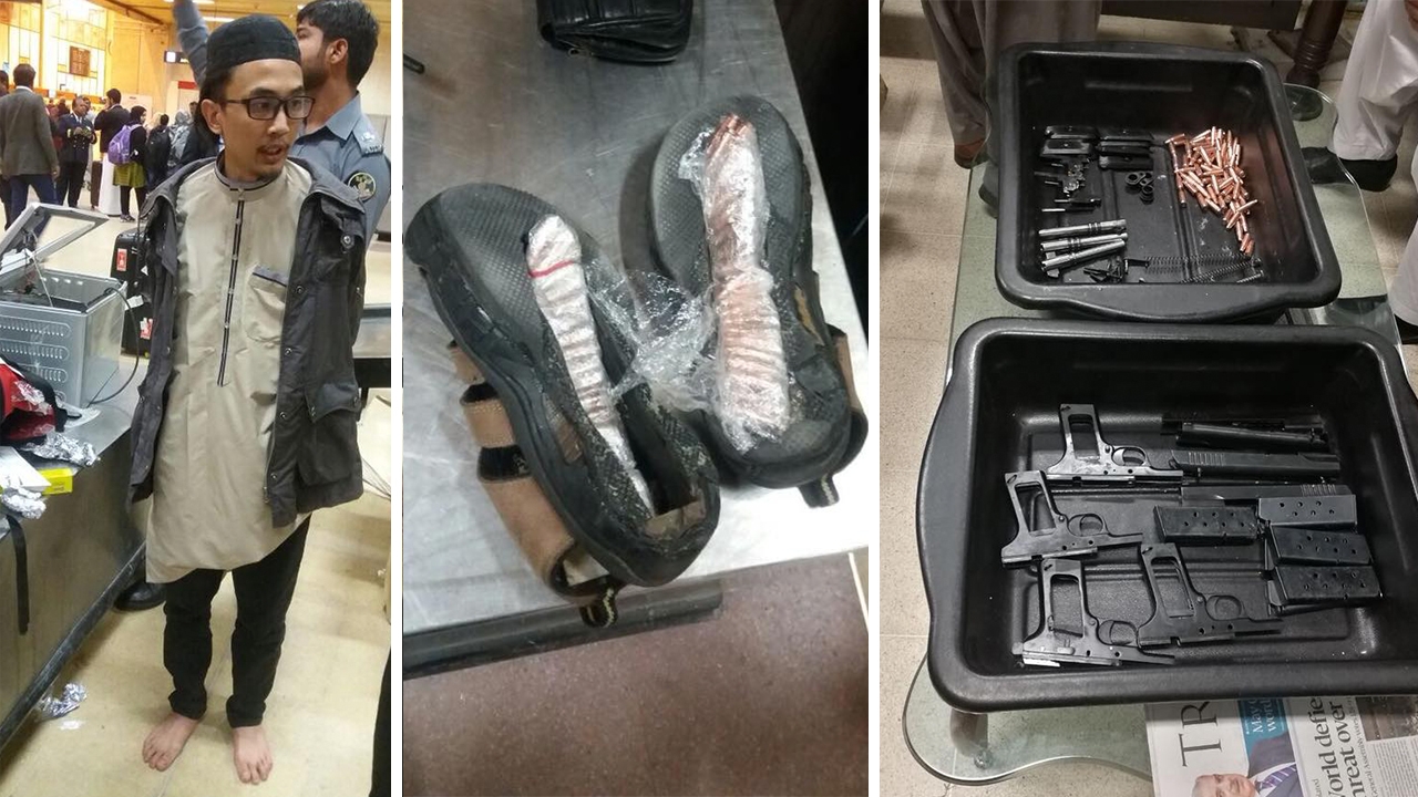 ทั้งนี้อาวุธที่พบในกระเป๋าเดินทางของเขาประกอบด้วย ปืนพกที่คาดว่าจะเป็นปืนโทคาเรฟ ขนาด 9 มม.จำนวน 4 กระบอก ถูกถอดเป็นชิ้นส่วน พร้อมแม็กกาซีน 4 อัน และยังพบ กระสุนอีก 70 นัด ถูกซุกไว้ใต้พื้นรองเท้าที่เขาใส่ โดยเขาเดินทางมายังปากีสถานครั้งแรก เมื่อสัปดาห์ที่แล้ว อย่างไรก็ตาม จนท.ไม่มั่นใจว่าอาวุธที่เขาพกมานั้นจะนำเอามาใช้ก่อเหตุไฮแจ๊ค หรือ จี้เครื่องบินหรือไม่.