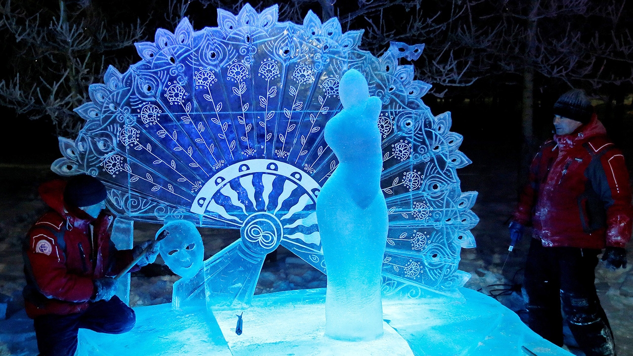ทีมนักสลักน้ำแข็งรัสเซีย “แมจิก ไอซ์” (Magic Ice) กำลังตกแต่งประติมากรรมน้ำแข็งที่สลักออกมาได้วิจิตรงดงาม เป็นทรงคล้ายมนุษย์และพัดขนาดใหญ่ ผลงานนี้ชื่อว่า “เฟซเลส” (Faceless) ที่แปลว่าไร้ตัวตน จัดแสดงในงานเทศกาลประติมากรรมหิมะและน้ำแข็งนานาชาติ “เดอะ แมจิคัล ไอซ์ ออฟ ไซบีเรีย” (The Magical Ice of Siberia) ซึ่งมีประจำปีทุกช่วงต้นปีของเมืองครัสโนยาสค์ ประเทศรัสเซีย.