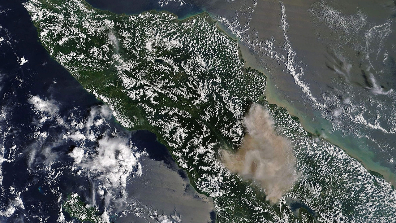 องค์การบริหารการบินและอวกาศแห่งชาติสหรัฐอเมริกา หรือองค์การนาซา เผยภาพสังเกตการณ์เหนือพื้นโลกจากดาวเทียม เป็นสีแบบธรรมชาติ แสดงพื้นที่การปะทุของภูเขาไฟซินาบุง ซึ่งมีลักษณะของกรวยภูเขาไฟสลับชั้น (stratovolcano) บนเกาะสุมาตราในอินโดนีเซีย หลังจากที่เกิดปะทุเมื่อวันที่ 19 ก.พ.ที่ผ่านมา ทำให้มีควันพวยพุ่งไปในท้องฟ้าถึง 5,000 เมตร และเศษเขม่าร่วงตกลงมาในพื้นที่ชุมชนใกล้เคียง.