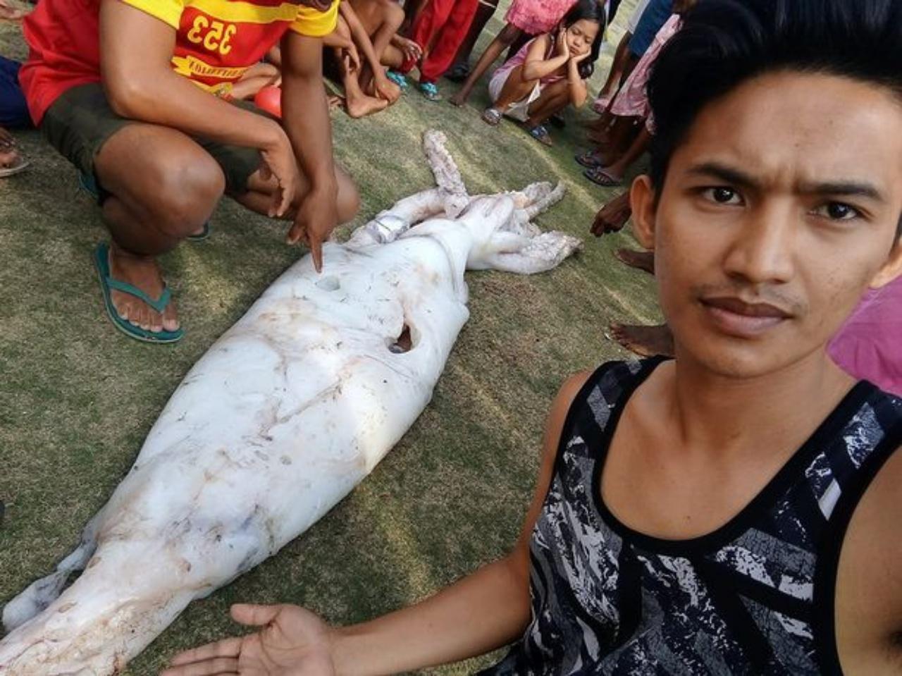 หนุ่มนักประมงในเกาะทางใต้ของฟิลิปปินส์จับหมึกตัวใหญ่ ยาวถึง 2.4 เมตรได้ขณะออกหาปลา ทำให้ชาวบ้านแห่มามุงดูด้วยความประหลาดใจ...