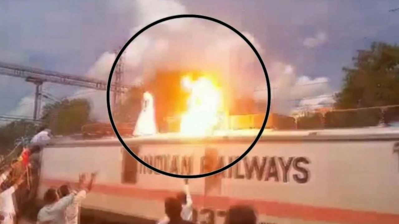 หนุ่มอินเดียปีนรถไฟขณะชุมนุมประท้วงในรัฐทมิฬนาฑู แต่พลาดไปถูกสายไฟฟ้าแรงสูง จนโดนช็อตไฟลุกท่วม ตอนนี้ยังไม่รู้เป็นหรือตาย...