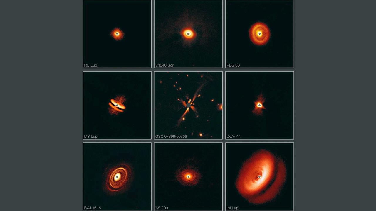 หอดูดาวท้องฟ้าซีกใต้แห่งยุโรป (European Southern Observatory–ESO) เผยภาพจากกล้องโทรทรรศน์ขนาดใหญ่ (Very Large Telescope–VLT) ที่ติดตั้งอยู่ในประเทศชิลี ซึ่งจับภาพบรรดาจานฝุ่นก๊าซที่ส่องสว่างและชุมนุมกันอย่างหนาแน่นล้อมรอบดาวฤกษ์เกิดใหม่ โดยจานฝุ่นก๊าซเหล่านี้มีขนาดและรูปร่างแตกต่างกันโดยสิ้นเชิง เช่น คล้ายวงแหวนสว่าง วงแหวนสีเข้ม บางจานก็เหมือนแฮมเบอร์เกอร์ และวางตำแหน่งที่ต่างกันทั้งหันหน้าหรือหันข้าง