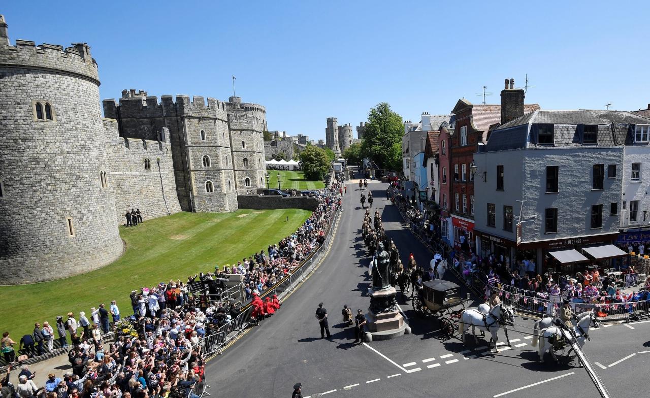 เวลา 13.00 น. ภายหลังเสร็จพิธีในโบสถ์แล้ว คู่บ่าวสาวจะประทับบนรถม้า แอสคอต แลนเดา เสด็จพระดำเนินรอบพระราชวังวินด์เซอร์ โดยขบวนรถม้าของคู่บ่าวสาวจะผ่านใจกลางเมืองวินด์เซอร์ เพื่อให้ผู้มารอชมพิธีหลายพันคนได้ชื่นชม ซึ่งคาดว่าจะใช้เวลาประมาณ 25-30 นาที ก่อนขบวนรถม้าพระที่นั่งของคู่บ่าวสาวจะกลับเข้าไปในพระราชวังวินด์เซอร์อีกครั้ง