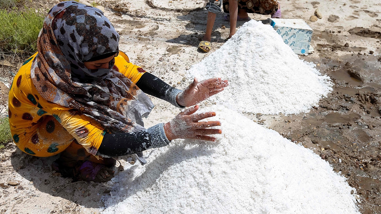หญิงชาวอิรักกำลังเก็บเกลือจากบริเวณบึงน้ำเค็มที่มีฝนตกในเมือง Qaryat Barnun ตั้งอยู่ใกล้กับเมืองบาบิโลนโบราณ ห่างจากตอนใต้ของกรุงแบกแดดของอิรักประมาณ 120 กิโลเมตร ซึ่งฤดูเก็บเกลือที่นี่มักจะใช้เวลาตั้งแต่เดือน เม.ย.หรือ พ.ค. ไปจนถึง ต.ค.ของทุกปี เกลือเหล่านี้จะบรรจุลงถุงขายและถูกส่งไปยังโรงงานเพื่อทำการบดละเอียดก่อนนำไปผ่านกระบวนการทำให้บริสุทธิ์ต่อไป.