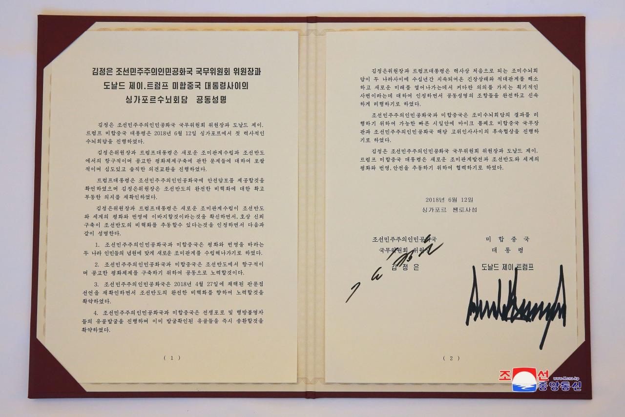 ลายเซ็นของทรัมป์ ทางด้านซ้าย เป็นลายเซ็นตัวอักษรใหญ่เท่ากันหมด ‘มีความกล้า แหลมคม และตัวอักษรสีดำเข้มทั้งหมด’ ในขณะที่ลายเซ็นของคิม จอง อึน ทางด้านขวา เป็นลายเซ็น ‘ในแนวเฉียงขึ้น เบาบาง และมีช่องห่างระหว่างตัวอักษรมาก’ โดยเหล่าผู้เชี่ยวชาญด้านการวิเคราะห์ลายมือชี้ว่า ลายเซ็นของคิม จอง อึน ที่เฉียงขึ้น บ่งชี้ว่าเป็นคล่องแคล่ว และถือเอาตัวเองเป็นศูนย์กลาง