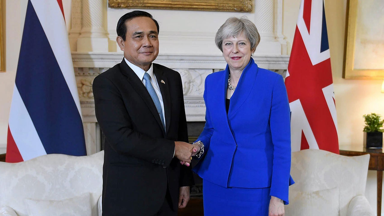 นางเทเรซา เมย์ นายกฯ อังกฤษ เปิดบ้านเลขที่ 10 Downing Street ให้การต้อนรับ พร้อมจับมือทักทาย พล.อ.ประยุทธ์ จันทร์โอชา นายกฯ และหัวหน้า คสช. ระหว่างการเยือนสหราชอาณาจักร ซึ่งถือเป็นครั้งแรกในรอบ 4 ปี.