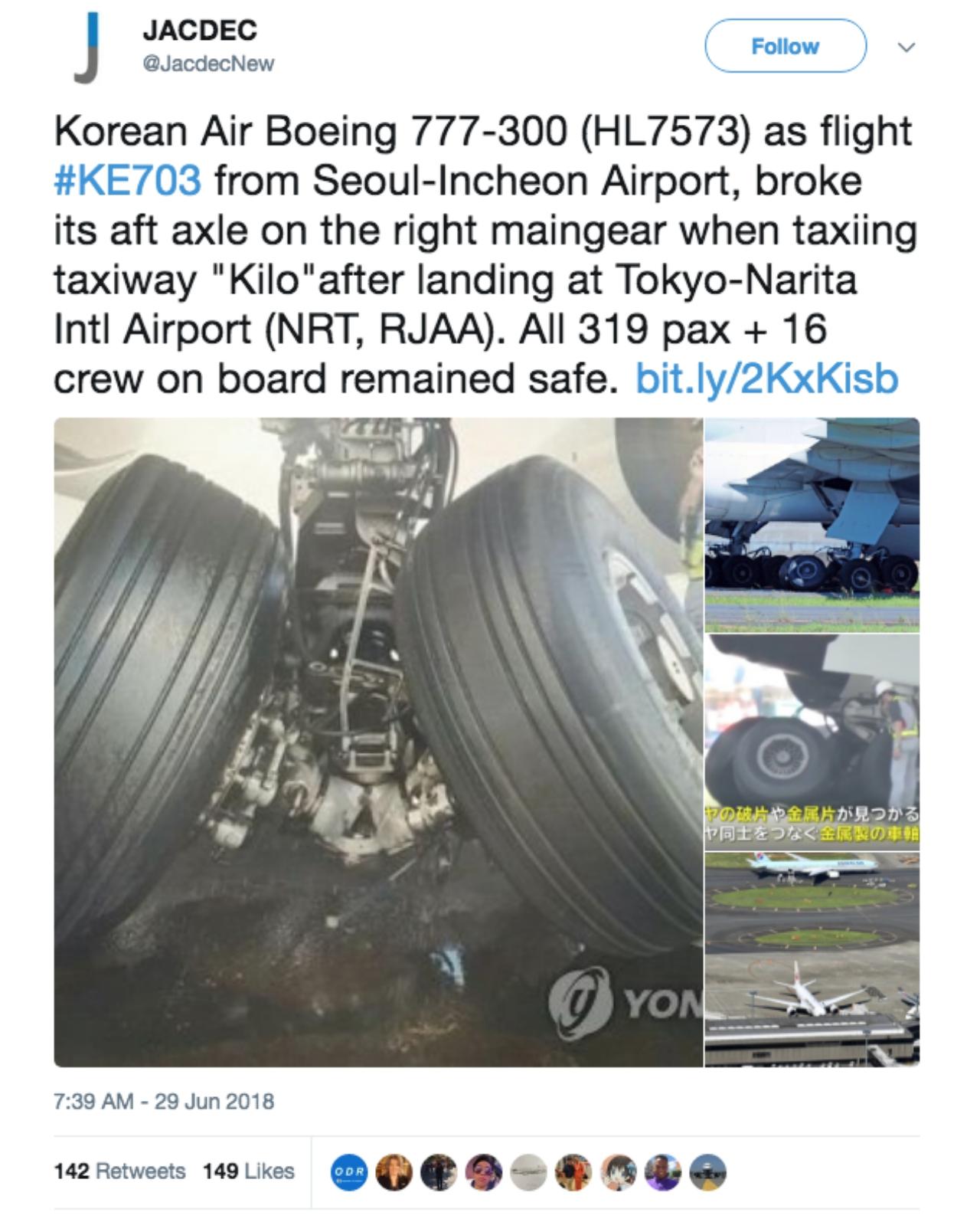 เมื่อ 30 มิ.ย.61 เว็บไซต์ airlive และสำนักข่าวยอนฮัพของเกาหลีใต้ รายงานพร้อมกับเผยแพร่คลิปเหตุการณ์นาทีระทึก เครื่องบินโดยสารโบอิ้ง 777-300 ของสายการบินโคเรียน แอร์ (Korean Air) เที่ยวบิน KE703 จากกรุงโซล เกาหลีใต้ ประสบเหตุล้อด้านขวาของเครื่องบินเสีย ขณะกัปตันนำเครื่องบินลงจอดบนรันเวย์ของท่าอากาศยานนาริตะในกรุงโตเกียว เมืองหลวงญี่ปุ่น เมื่อเวลาประมาณ 00.35 น. ของเช้าวันที่ 29 มิ.ย. ตามเวลาท้องถิ่น จนเกิดฝุ่นตลบ เครื่องบินกระแทกพื้นรันเวย์อย่างรุนแรง โดยกัปตัน สามารถบังคับเครื่องบินไม่ให้ไถลออกนอกรันเวย์ได้สำเร็จ