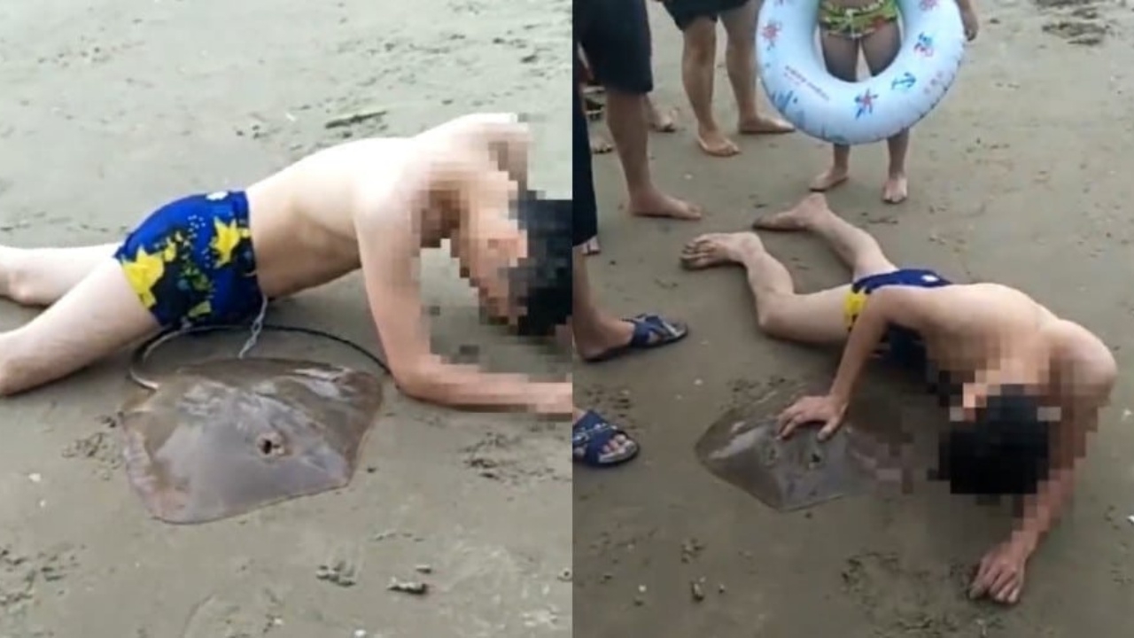 หนุ่มชาวจีนลงเล่นน้ำในทะเล ก่อนที่เขาจะถูกกระเบนตัวหนึ่งแทงเงี่ยงปักเข้าไปที่อวัยวะเพศ จนเขาต้องขึ้นมานอนร้องโอดโอยบนหาด ท่ามกลางคนจำนวนมากที่มามุงดู...