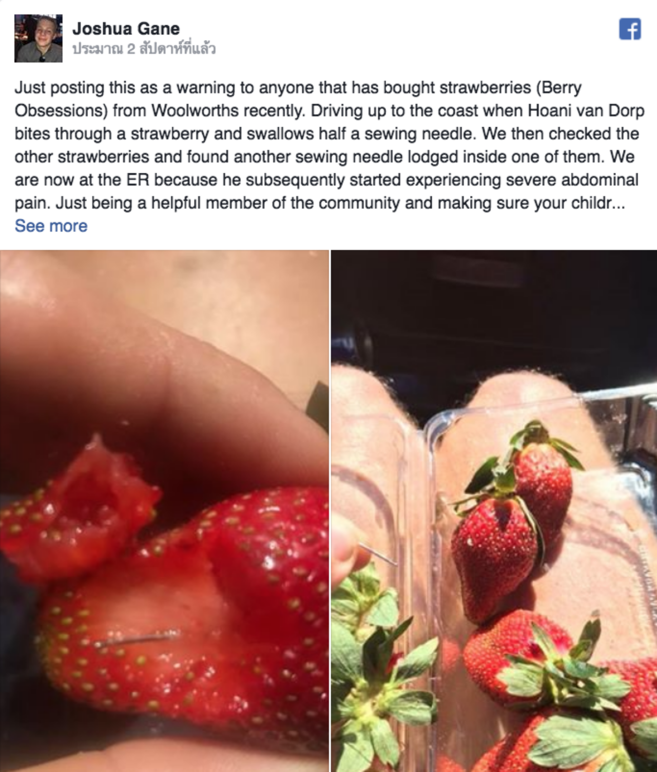 ต้นเดือนกันยายน 2561 ชาวออสเตรเลียเริ่มรู้ข่าว มีคนแอบซ่อนเข็มในสตรอว์เบอร์รีครั้งแรกจนรู้สึกเสียวลำคอขึ้นมาทันที หลังจากมีชายใช้ชื่อว่า Joshua Gane โพสต์ข้อความลงในเฟซบุ๊ก แจ้งเตือนให้คนในสังคมระมัดระวังอันตราย หลังจากเพื่อนของเขา ซึ่งเป็นชาย อายุ 21 ปี ได้กินและกลืนผลสตรอว์เบอร์รีที่มีเข็มซ่อนอยู่ จนต้องถูกนำตัวส่งโรงพยาบาล เนื่องจากมีอาการเจ็บและปวดท้องอย่างรุนแรง