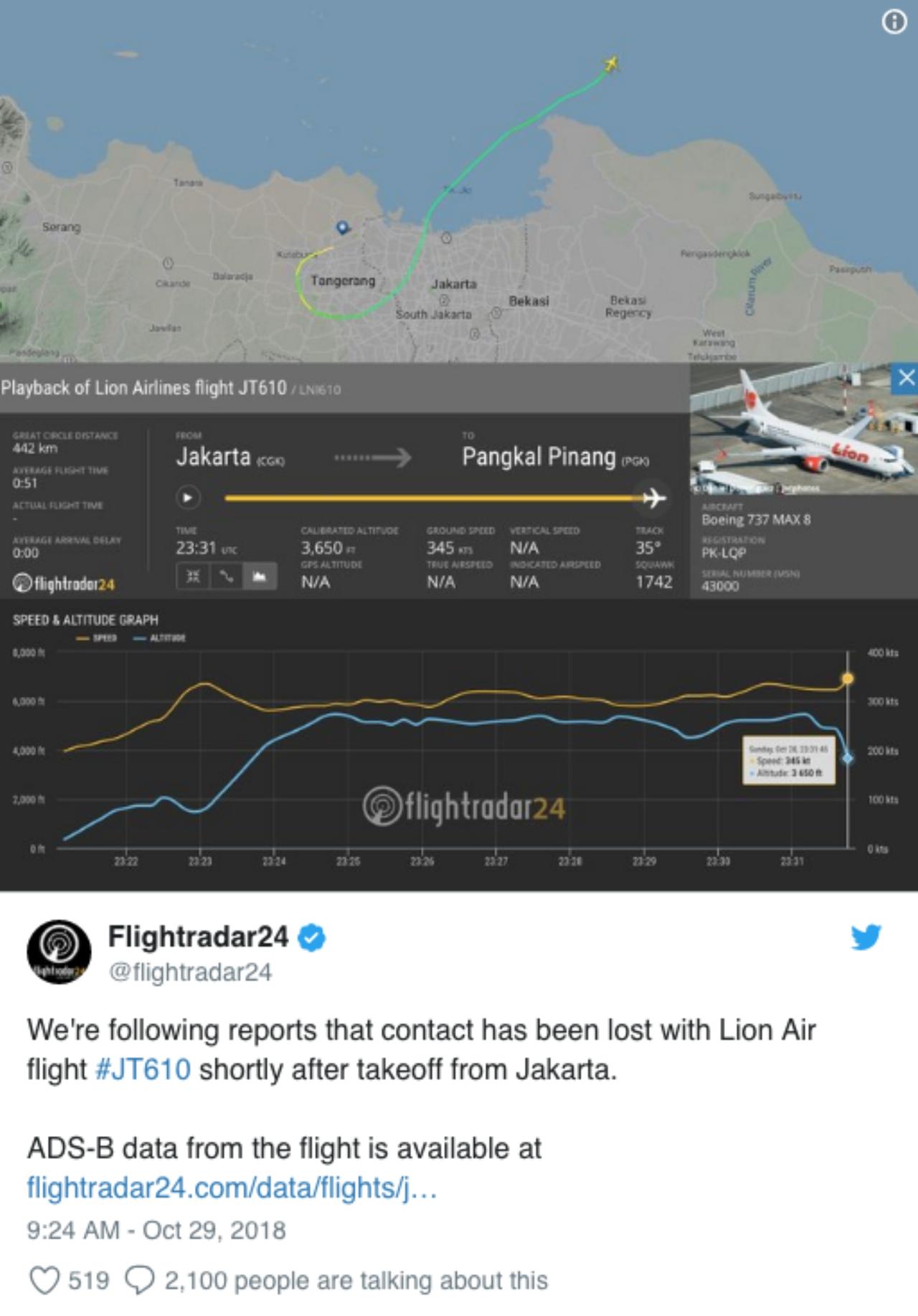 ระทึก..เครื่องบินโดยสารไลอ้อน แอร์ ประสบเหตุตกในทะเลนอกชายฝั่งเกาะสุมาตรา หลังนำผู้โดยสารและลูกเรือรวม 189 ชีวิตทะยานออกจากสนามบินกรุงจาการ์ตา แค่เพียงไม่กี่นาที