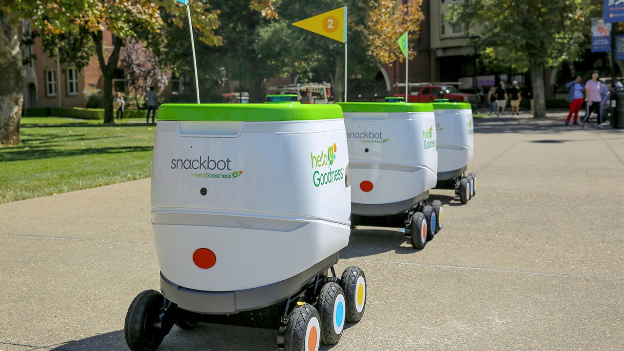 หุ่นยนต์ขับเคลื่อนได้ด้วยตัวเองผลงานการพัฒนาสร้างของบริษัทร็อบบี้ เทคโนโลยี วิ่งเป็นแถวแนวตรงโดยบรรทุกสินค้าจำพวกขนมขบเคี้ยวของบริษัทด้านอาหารและเครื่องดื่มแห่งหนึ่งไปส่งถึงลูกค้าภายในมหาวิทยาลัยแปซิฟิก ที่เมืองสตอกตัน รัฐแคลิฟอร์เนีย สหรัฐอเมริกา ซึ่งบรรดานักศึกษาจะสั่งซื้อของกินเล่นรวมถึงเครื่องดื่มผ่านแอปพลิเคชัน จากนั้นก็รอเจ้าหุ่นยนต์ 6 ล้อมาส่งของถึงที่หมาย.