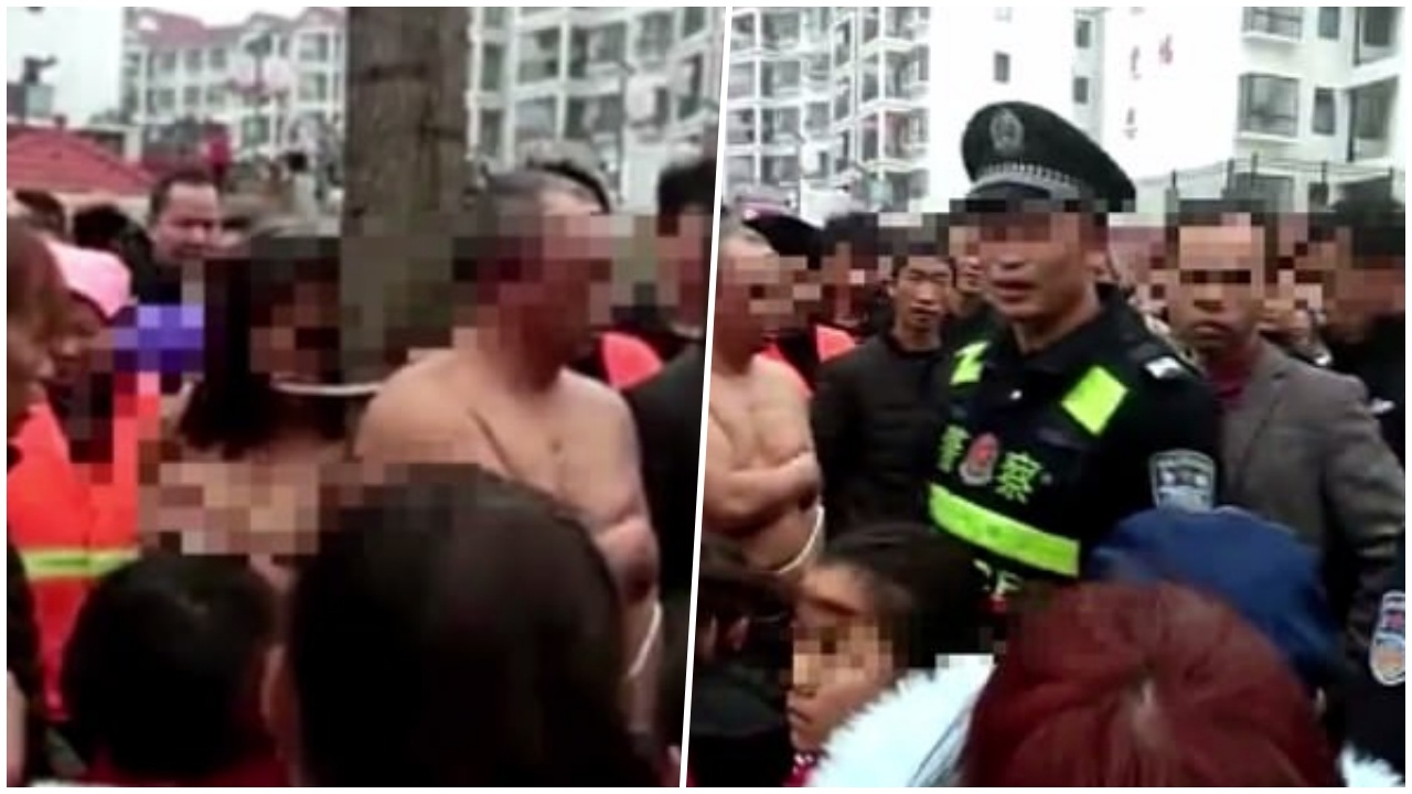 เหตุการณ์นี้เกิดขึ้นที่เขตฮุ่ยฉุย ในมณฑลกุ้ยโจว ทางใต้ของประเทศจีน เมื่อวันพุธที่ 20 ก.พ. ที่ผ่านมา โดยมีการเผยแพร่คลิปวิดีโอแสดงให้เห็นว่า ชายหญิงคู่หนึ่งถูกมัดติดกับต้นไม้ในสภาพที่ไม่สวมเสื้อผ้าเลยแม้แต่ชิ้นเดียว โดยมีประชาชนจำนวนมากยืนมุงดู