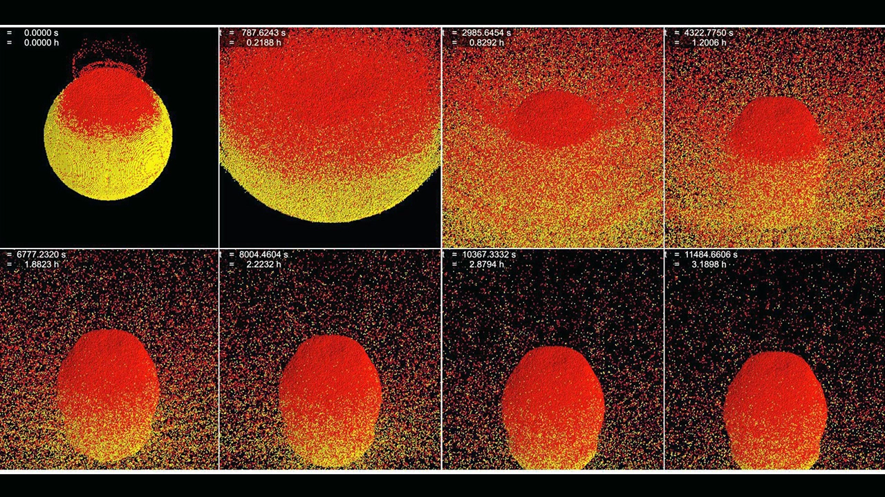 ทีมวิจัยจำลองกระบวนการ 2 ขั้นตอนคือระยะการแตกกระจายช่วงสั้นๆที่เกิดขึ้นในเสี้ยววินาที และการสะสมแรงโน้มถ่วงเป็นเวลานาน ซึ่งพบว่า ผลสุดท้ายของการชนดาวเคราะห์น้อยไม่ใช่แค่กลายเป็นกองหิน แต่กลุ่มของชิ้นส่วนที่ไม่แข็งแรงกลับถูกยึดไว้อย่างแน่นหนาด้วยแรงโน้มถ่วง แทนที่ดาวเคราะห์น้อยจะได้รับผลกระทบ ทว่ายังคงมีความแข็งแรงอย่างมากเพราะมันไม่ได้แตกอย่างสมบูรณ์