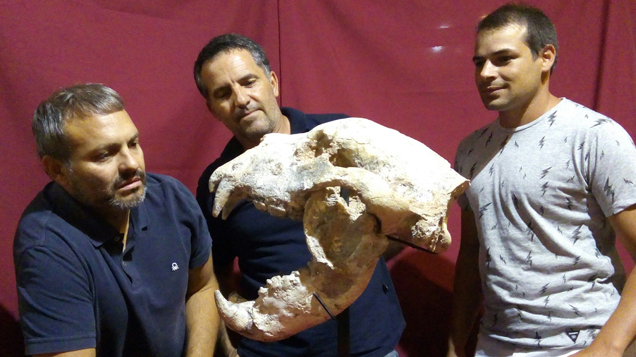 มหาวิทยาลัยลามาทานซา เผยภาพ 3 นักวิทยาศาสตร์ ชาวอาร์เจนตินาถือซากดึกดำบรรพ์หรือฟอสซิลกะโหลกศีรษะหมียักษ์ ซึ่งพวกเขาพบซากฟอสซิลของสัตว์ดังกล่าวฝังอยู่ใต้ดิน ห่างออกไปประมาณ 170 กิโลเมตรทางตอนเหนือของกรุงบัวโนสไอเรส ประเทศอาร์เจนตินา โดยระบุว่าซากนี้ถูกฝังมานานราว 700,000 ปี.