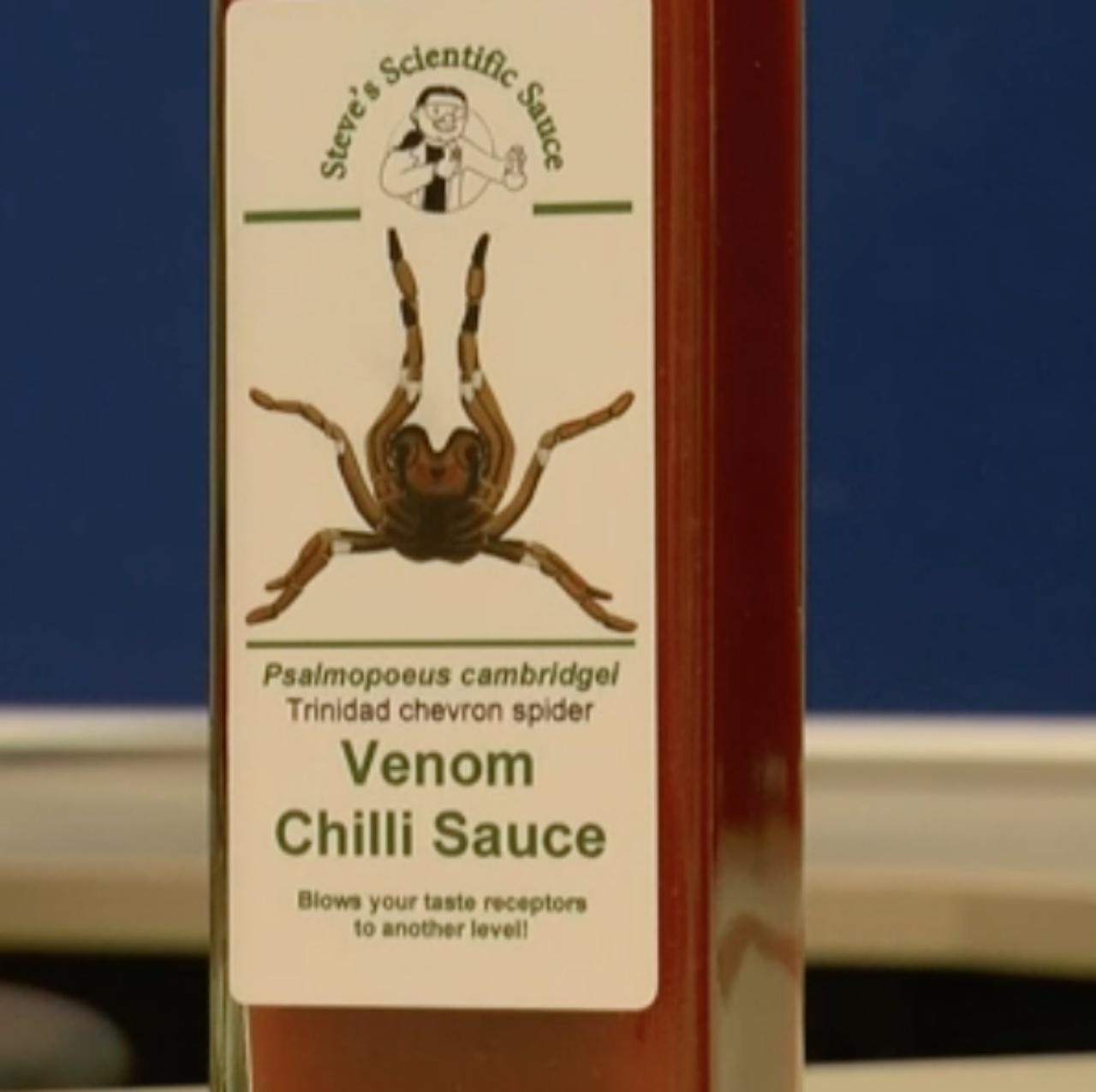 แม้ “เวนอม” จะหมายถึงพิษสัตว์ แต่ซอสพริกเวนอม ทำมาจากพิษสังเคราะห์ โดยทดลองจากพิษของแมงมุมพิษทารันทูลาของตรินิแดด ที่หากใครโดนแมงมุมชนิดนี้กัดเข้าก็จะมีอาการกล้ามเนื้อกระตุกและปวดแสบปวดร้อน ส่วนที่ต้องเป็นพิษสังเคราะห์ก็เพราะเป็นไปไม่ได้ที่จะใช้พิษจริง อีกทั้งสำนักงานมาตรฐานอาหารก็ไม่ยินยอม