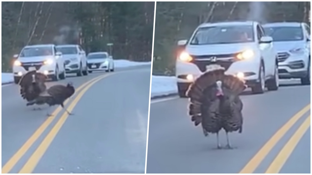 ผู้คนสุดประทับใจ ไก่งวง ยืนกั้นจราจร ให้เพื่อนๆ เดินข้ามถนนอย่างปลอดภัย กระทั่งไก่งวงตัวสุดท้ายมาครบ ไก่งวงที่ยืนขวางถนน ก็จบภารกิจ หมุนตัวเดินตามไปอย่างสบายใจ