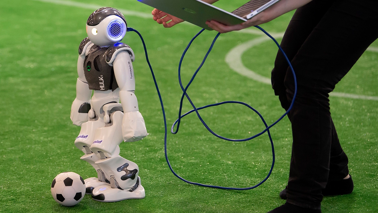 หุ่นยนต์นักเตะเหลือบตามองไปด้านหลังเพื่อรอสัญญาณจากผู้ควบคุมด้วยเครื่องคอมพิวเตอร์พกพา เตรียมลงแข่งในรายการ “สแตนดาร์ด แพลตฟอร์ม ลีกา” (Standard Platform Liga) ที่โรโบคัพ เยอรมัน โอเพ่น 2019 (RoboCup German Open 2019) จัดขึ้นที่เมืองมัคเดอบวร์ก ในเยอรมนี ซึ่งมีทีมจาก 16 ประเทศเข้าร่วมประชันความทันสมัยของวิทยาการหุ่นยนต์ และยังมีการแสดงหุ่นยนต์กู้ภัยรวมถึงหุ่นยนต์บริการด้วยเช่นกัน.