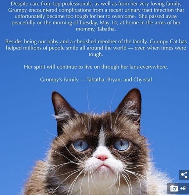 ‘พวกเราเสียใจอย่างคาดคิดไม่ถึง ที่จะประกาศข่าวการสูญเสียของ กรัมปี้ แคท แมวที่เป็นที่รักยิ่งของพวกเรา’ แถลงการณ์แสดงความเสียใจต่อการจากไปของ กรัมปี้ แคท พร้อมระบุว่า ถึงแม้ทีมสัตวแพทย์ที่มีความเชี่ยวชาญจะพยายามรักษาอย่างเต็มที่ แต่ก็ไม่อาจช่วยชีวิตไว้ได้ กรัมปี้ แคท ได้จากไปอย่างสงบ เมื่อเช้าวันอังคารที่ 14 พ.ค. 62 ที่บ้าน ภายใต้อ้อมกอดของแม่, ทาบาธา ซึ่งหลังจากผู้คนทราบข่าว กรัมปี้ แคท ตายแล้ว พากันแสดงความเสียใจ และแสดงความอาลัยต่อการจากไปอย่างไม่ทันเตรียมใจ
