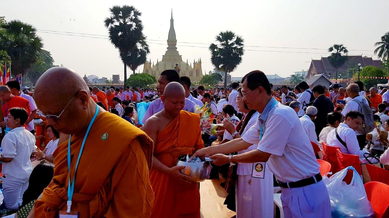 ชาวพุทธในสปป.ลาว และคณะสถาบันโพธิคยาวิชชาลัย 980, มูลนิธิวีระภุชงค์ จากไทยหลายพันคนแห่ร่วมพิธีตักบาตรพระสงฆ์กว่า 1,000 รูป ในวันวิสาขบูชา แน่นขนัดวัดพระธาตุหลวง กลางนครหลวงเวียงจันทน์...