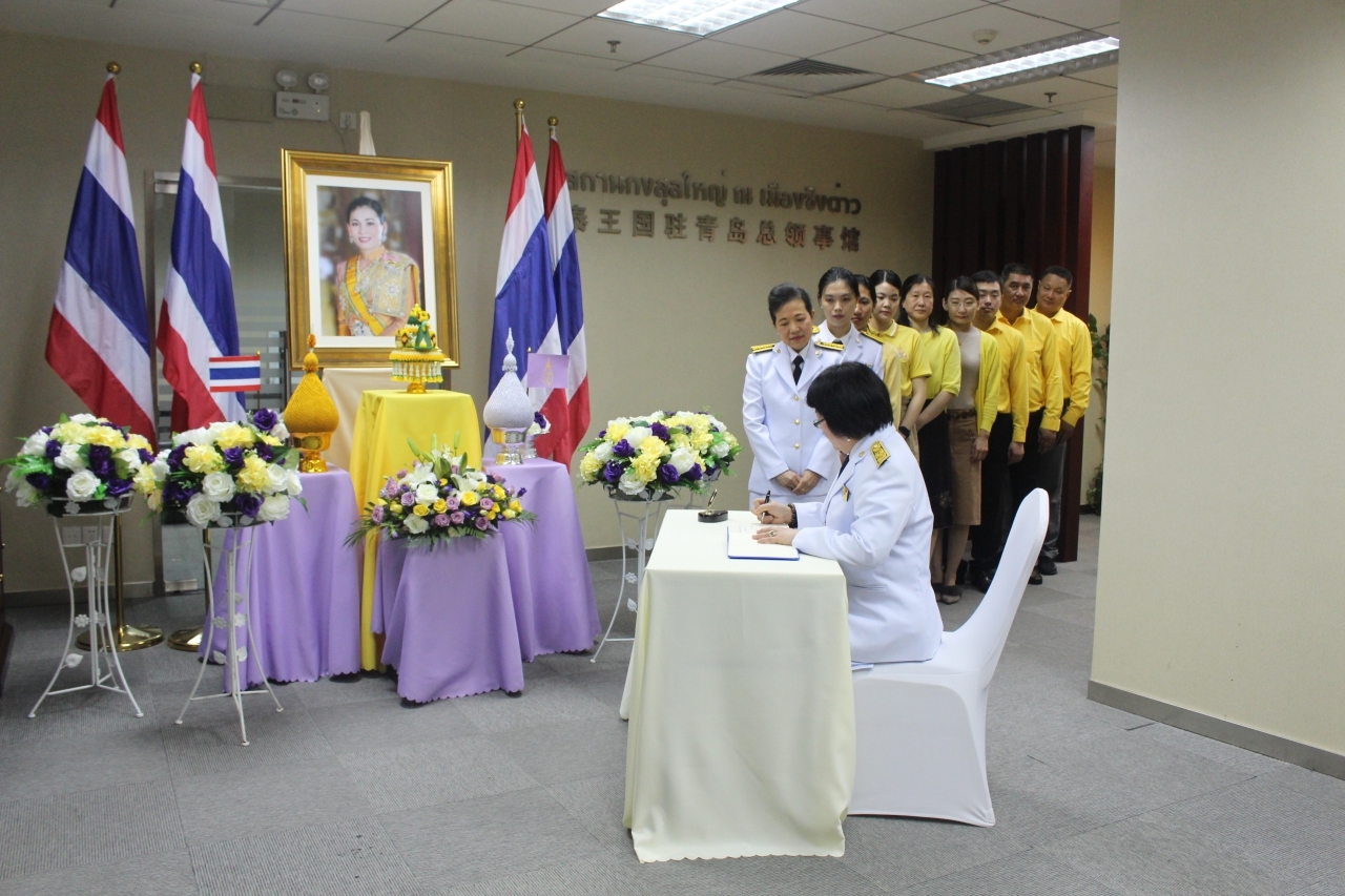 ด้านสถานกงสุลใหญ่ ณ เมืองชิงต่าว ประเทศจีน มี นางสาวนภัสพร ภัทรีชวาล กงสุลใหญ่ ณ เมืองชิงต่าว เป็นประธาน พร้อมด้วยข้าราชการ เจ้าหน้าที่สถานกงสุลใหญ่ฯ ตลอดจนชาวไทยในเมืองชิงต่าวเข้าร่วมพิธี โดยกงสุลใหญ่ฯ ได้เป็นประธานนำสวดมนต์ถวายพระพรชัยมงคลและนั่งสมาธิถวายพระราชกุศลแด่สมเด็จพระนางเจ้าฯ พระบรมราชินี จากนั้น ประธานนำผู้เข้าร่วมพิธีลงนามถวายพระพร เพื่อแสดงความจงรักภักดีและสำนึกในพระมหากรุณาธิคุณ