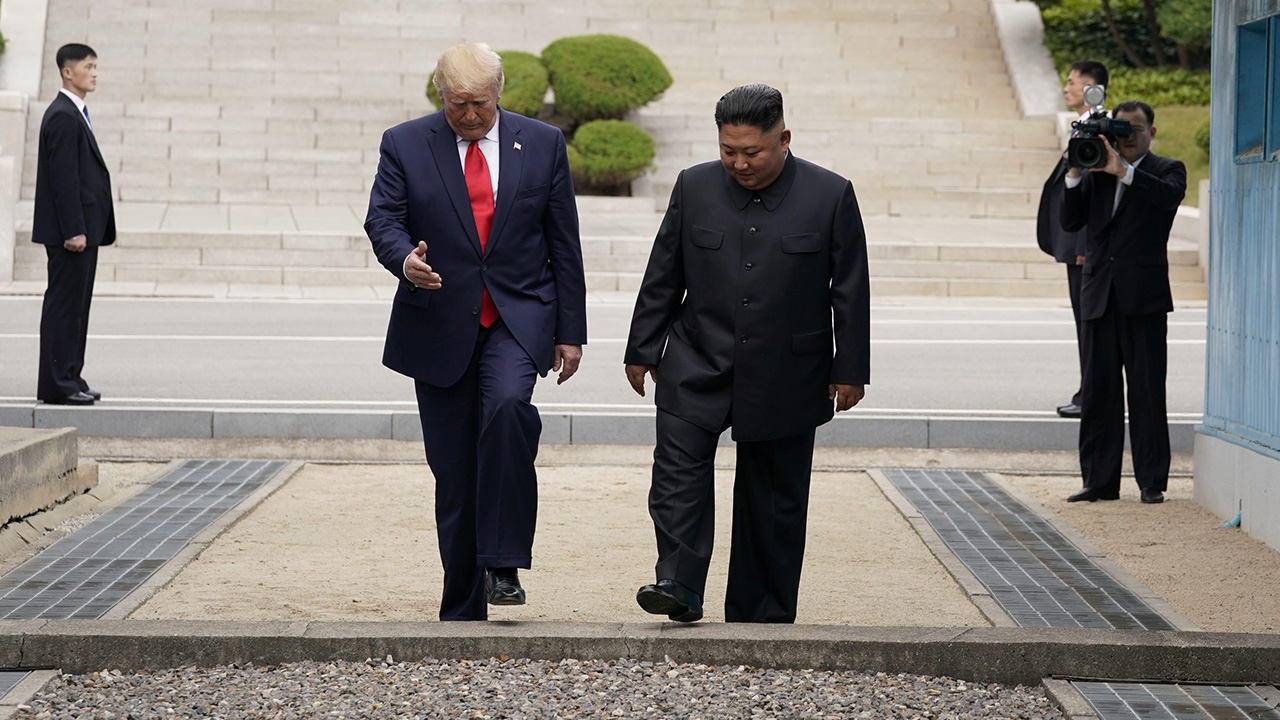 นายโดนัลด์ ทรัมป์ ประธานาธิบดีสหรัฐฯ ผายมือให้นายคิม จอง อึน ผู้นำเกาหลีเหนือก้าวเท้าไปก่อน ขณะพากันเดินข้ามเส้นแบ่งเขตแดนสองเกาหลีไปยังฝั่งเกาหลีใต้ หลังทั้งคู่ได้พบปะพูดคุยอย่างเป็นกันเอง.