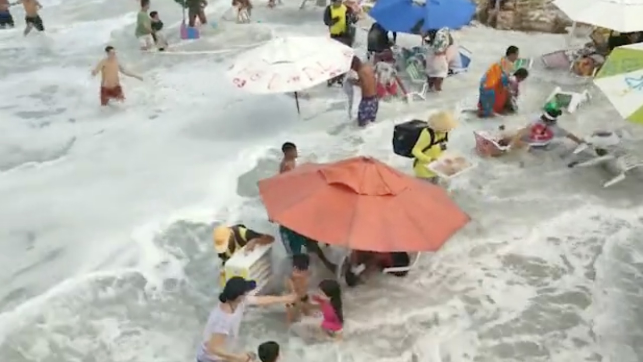 จากนั้นไม่กี่วินาทีต่อมา หลังจากคลื่นใหญ่ซัดชายหาดและถอยกลับสู่ทะเล ทำให้บรรดานักท่องเที่ยวรีบวิ่งลงไปเก็บข้าวของ เก้าอี้ ที่ถูกคลื่นซัด และตรวจดูบุตรหลานเพื่อให้มั่นใจว่าทุกคนปลอดภัย ขณะที่เด็กๆ ยังคงส่งเสียงหวีดร้องเพราะตกใจ.