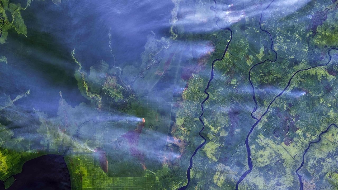เครื่องวัดกำลังงานแสงเชิงสเปกตรัมโมดิส (Moderate Resolution Imaging Spectroradiometer–MODIS) ที่ติดตั้งบนดาวเทียมอะควา (Aqua) ขององค์การนาซา เผยให้เห็นหมอกควันจากไฟไหม้ป่าลอยอยู่เหนือเกาะบอร์เนียว ซึ่งมีการแจ้งเตือนเรื่องคุณภาพอากาศและสุขภาพในอินโดนีเซีย รวมถึงประเทศเพื่อนบ้านทั่วเอเชียตะวันออกเฉียงใต้.