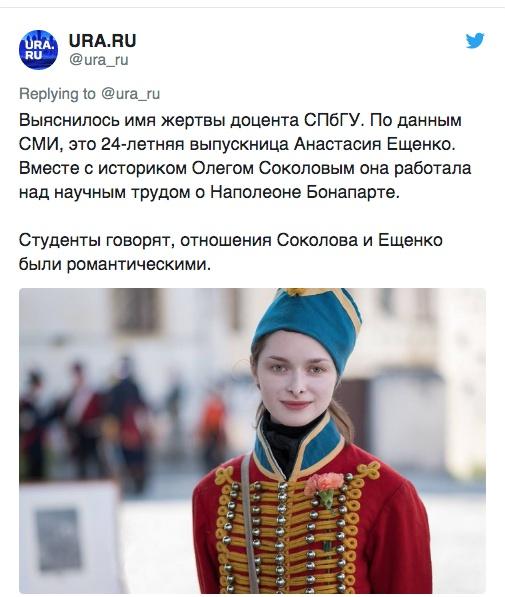ด้านนางสาวเยชเชโก มาจากเมืองคราสโนดาร์ เพื่อมาศึกษาที่มหาวิทยาลัยเซนต์ ปีเตอร์สเบิร์ก และจากนั้น ได้ทำงานเป็นนักวิจัยช่วยเหลืองานของ ศ.โซโคลอฟด้วย โดยคนรู้จักเธอต่างบอกว่า เยชเชนโก เป็นผู้หญิงเงียบๆ อ่อนหวาน และเป็นนักศึกษาที่มีอุดมคติ ขณะที่ทุกคนต่างรู้กันดีว่าเธอกับ ศ.โซโคลอฟ มีความสัมพันธ์กันก่อนจะต้องมาจบชีวิตอย่างน่าสะเทือนใจ