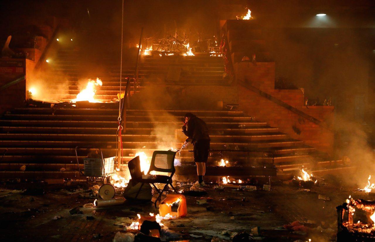 ตำรวจกับผู้ประท้วงปะทะกันตลอดทั้งคืน จนกระทั่งในเวลาประมาณ 05.30 น. วันจันทร์ที่ 18 ต.ค. 2562 ตามเวลาท้องถิ่น ตำรวจจึงเริ่มการผลักดันเพื่อยึดคืนโพลียู แต่ต้องเผชิญการตอบโต้ด้วยระเบิดขวดจนเกิดไฟลุกไหม้หลายจุด ทำให้เจ้าหน้าที่ต้องล่าถอยออกมา