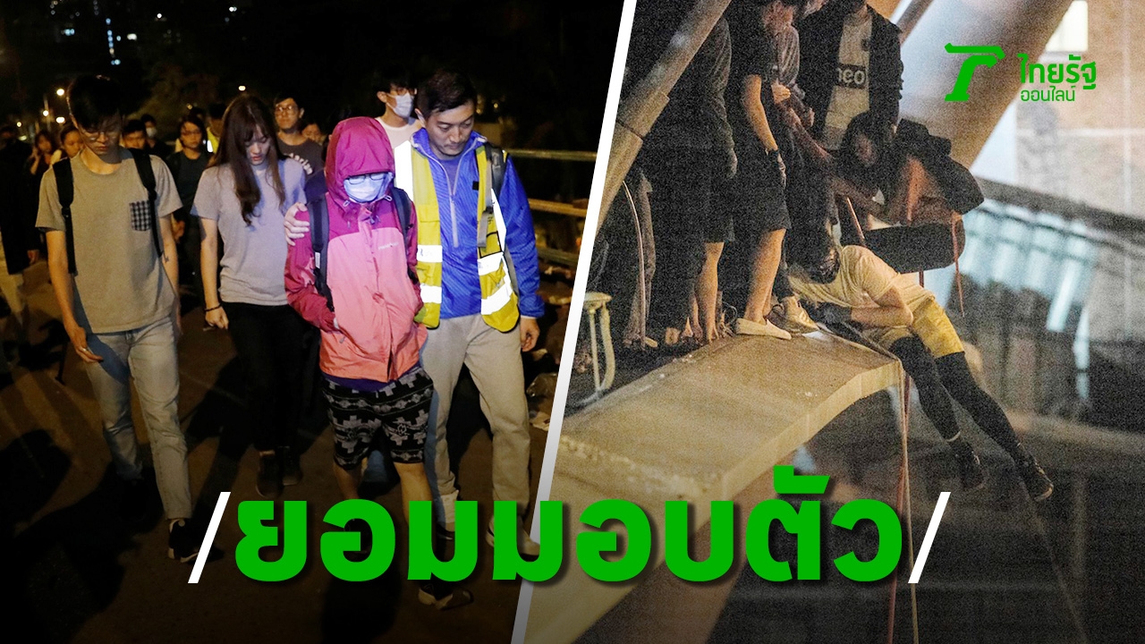 ผู้ชุมนุมในฮ่องกงโรยตัวจากสะพานเพื่อหนีจากมหาวิทยาลัยโพลีเทคนิค หลังตำรวจนำกำลังเข้าปิดล้อม ขณะที่ผู้ชุมนุมอีกกลุ่มยอมออกมามอบตัวแล้ว