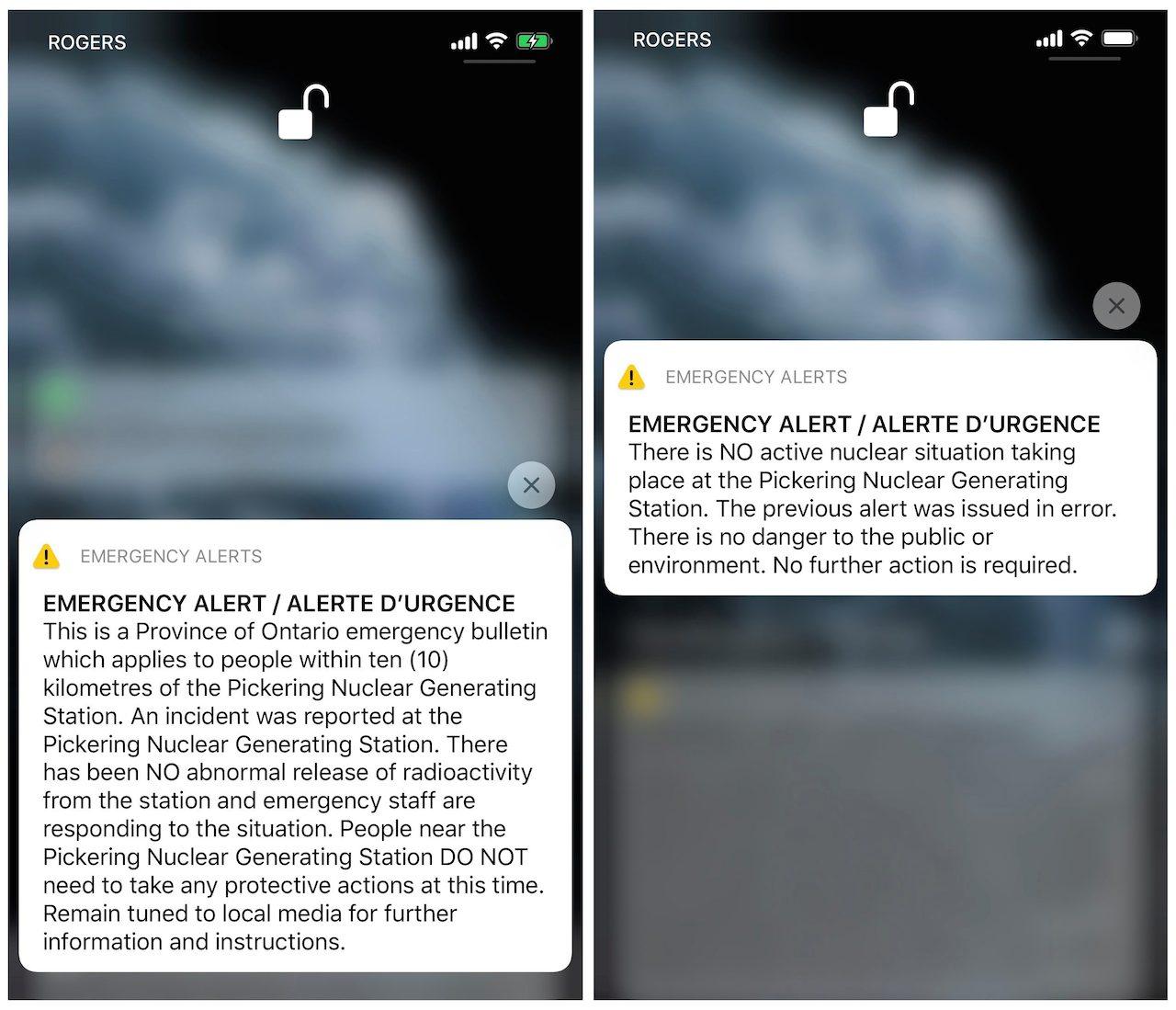 สำนักงานฉุกเฉินรัฐออนแทริโอส่งข้อความฉุกเฉินถึงประชาชน เตือนว่าเกิดสถานการณ์บางอย่างขึ้นที่โรงไฟฟ้านิวเคลียร์ ก่อนเจ้าหน้าที่จะชี้แจงว่าข้อความส่งไปด้วยความผิดพลาด