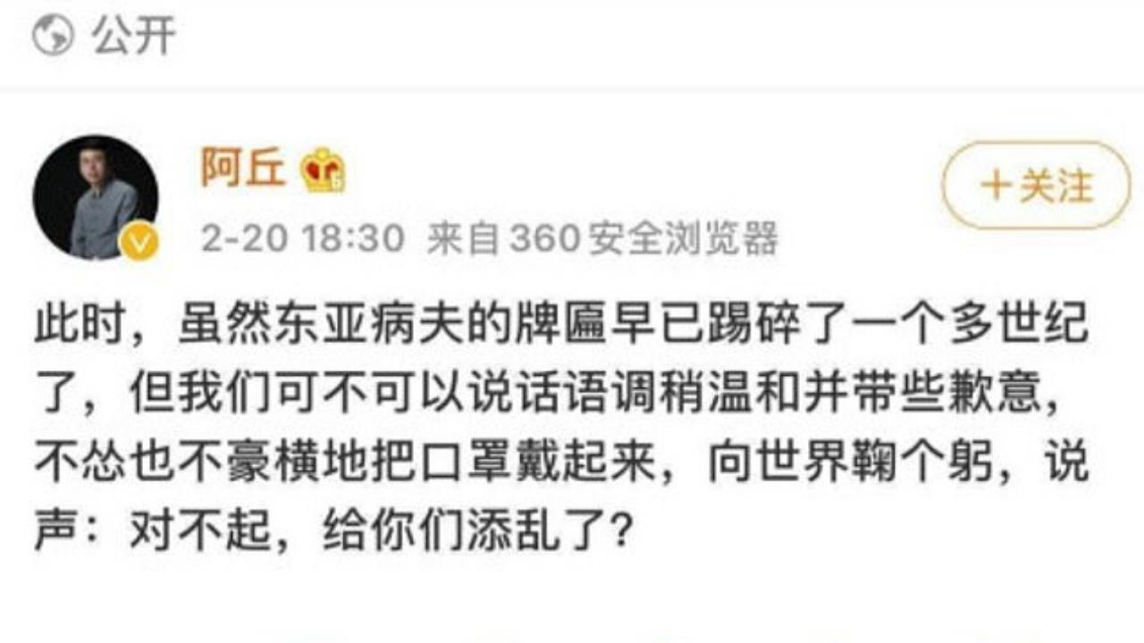 สำนักข่าวต่างประเทศรายงานว่า เว็บไซต์ Sina Entertainment รายงานอ้างแหล่งข่าวในแวดวงสื่อของจีนที่ระบุว่า นายชิว เม้งฮวง พิธีกรคนดังของ CCTV ที่จัดรายการประเภททอล์กโชว์วาไรตี้มานานกว่า 13 ปี ได้ถูกถอดออกจากรายการที่เขาทำหน้าที่พิธีกรอยู่ทั้งหมด หลังจากที่ไปโพสต์ลงในบัญชีส่วนตัว Weibo เรียกร้องให้คนจีนก้มหัวขอโทษชาวโลกที่เป็นต้นตอการแพร่ระบาดเชื้อ "โควิด-19" ไปทั่วโลก ซึ่งล่าสุดทำให้มีผู้ติดเชื้อทั่วโลกนับแสนราย เสียชีวิตไปกว่า 3,400 ศพ โดยข้อความของนายชิวได้สร้างกระแสความไม่พอใจให้กับชาวจีนจำนวนมาก จนเขาต้องตัดสินใจลบบัญชี Weibo