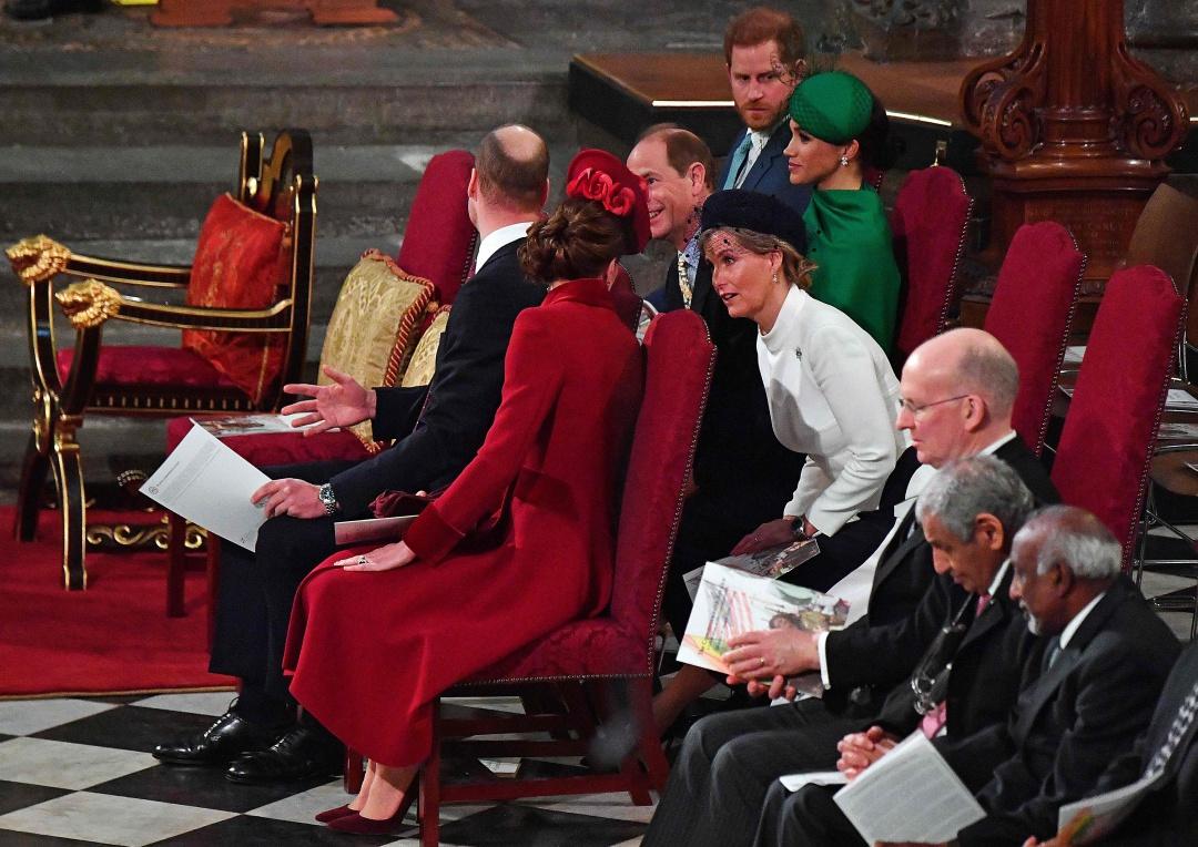 เมื่อเจ้าชายวิลเลียม ดยุคแห่งเคมบริดจ์ และแคเธอรีน ดัชเชสแห่งเคมบริดจ์ เสด็จมาถึงที่ประทับแล้ว เจ้าชายแฮร์รี่ และเมแกน ได้ทักทายว่า ‘hello’ และส่งยิ้มให้กับเจ้าชายวิลเลียม พระเชษฐา ที่ประทับอยู่พระที่นั่งแถวหน้า เคียงข้างพระชายา แคเธอรีน ก่อนที่ต่อมา สมเด็จพระราชินีเอลิซาเบธที่ 2 พร้อมด้วยเจ้าฟ้าชายชาร์ลส์ และคามิลลา ดัชเชสแห่งคอร์นวอลล์ ได้เสด็จพระราชดำเนินเข้ามาประทับในพระที่นั่งภายในมหาวิหารเวสต์มินสเตอร์ ในพระราชพิธีวันเครือจักรภพ