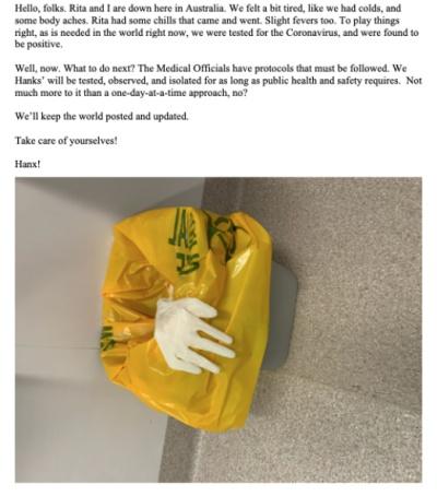 ด้าน ทอม แฮงค์ ซึ่งได้แจ้งข่าวการติดเชื้อโควิด-19 ให้สาธารณชนได้รับรู้ ยังบอกว่า ตอนนี้ เขาและภรรยาปฏิบัติตนตามข้อแนะนำของแพทย์ และกักตัวเองออกจากที่ชุมชน จนกว่าจะปลอดภัย พร้อมกันนั้น ยังบอกว่าเขาจะโพสต์ความคืบหน้าของอาการของเขาและภรรยา พร้อมทั้งขอให้ทุกคนดูแลสุขภาพของตนเองให้ดี