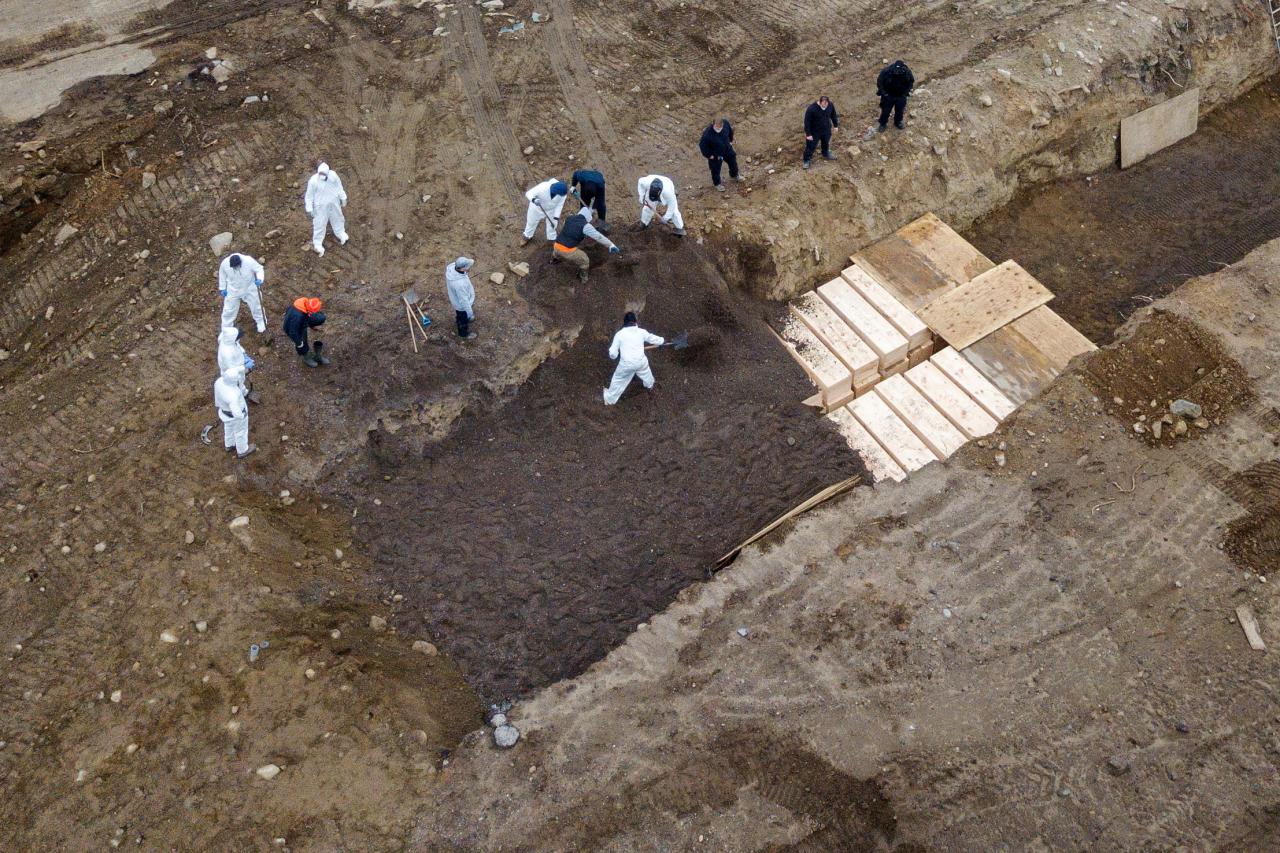 ทางการนครนิวยอ์ก ไม่มีทางเลือก ให้คนงานกว่าสิบคนใส่ชุดป้องกันเชื้อมิดชิด ลำเลียงศพ ผู้เสียชีวิตที่ไม่มีญาติมารับศพ ฝังลงในหลุมขนาดใหญ่บนเกาะฮาร์ต ขณะเชื้อโควิดกำลังระบาดหนัก