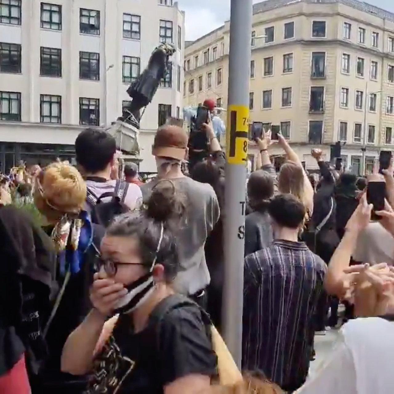 ในช่วงเช้าวันเดียวกันนี้ ที่เมืองบริสตอล เกิดเหตุผู้ชุมนุมรวมตัวกันใช้เชือกดึงโค่นรูปปั้นทองเหลืองของนาย ‘เอ็ดเวิร์ด โคลส์ตัน’ นักค้าทาสชื่อดังในยุคศตวรรษที่ 17 ผู้เป็นสมาชิกของบริษัท รอยัล แอฟริกัน ซึ่งขนส่งชาวแอฟริกันทั้งชาย, หญิง และเด็ก จำนวนกว่า 80,000 คนมายังอเมริกา