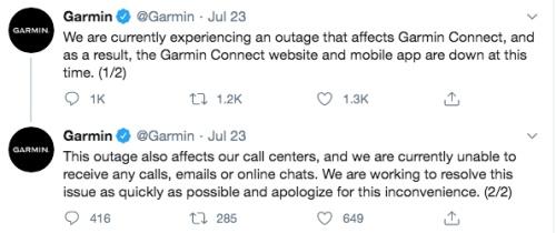Garmin Connect ยังใช้งานไม่ได้ หลังบริษัทการ์มิน แจ้งผ่านทวิตเตอร์ ประสบปัญหาเซิร์ฟเวอร์ดับมาตั้งแต่ 23 ก.ค. ขณะที่สื่อต่างประเทศเผย อาจโดนแฮกเกอร์โจมตีเรียกค่าไถ่