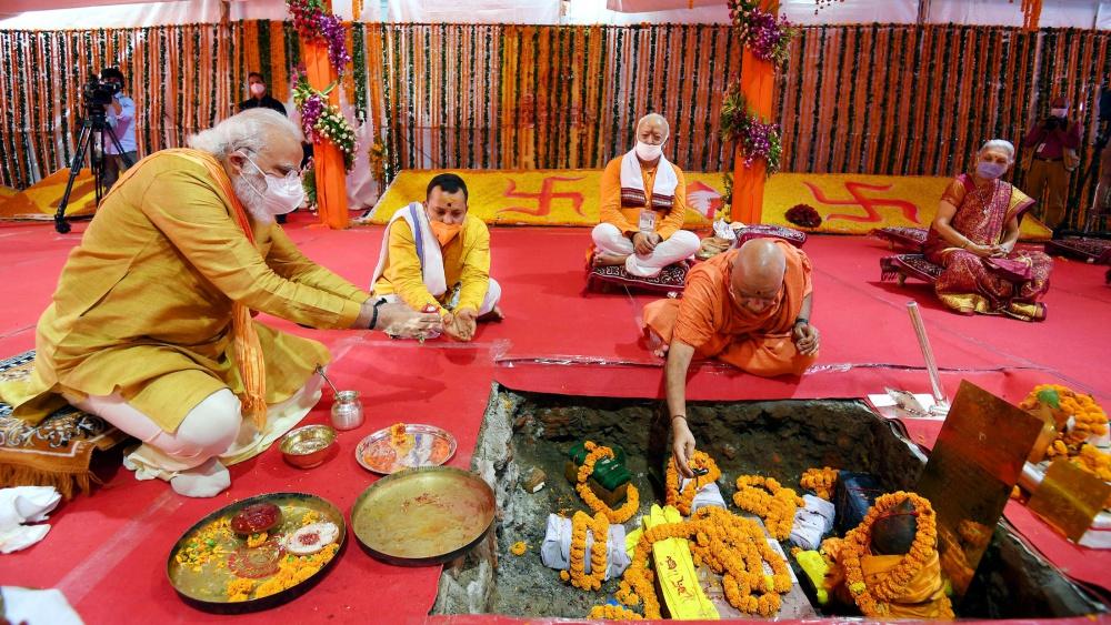 โดยนายกรัฐมนตรีนเรนทรา โมดี ได้ไปเป็นประธานวางศิลาฤกษ์ ซึ่งเป็นจุดที่ตั้งเพื่อเริ่มการก่อสร้างวัดฮินดูมหาศรีรามในเมืองอโยธยา รัฐอุตตรประเทศ ตามความเชื่อว่า สถานที่นี้เคยเป็นที่ประสูติขององค์ศรีรามหนึ่งในเทพตามหลักศาสนาฮินดู และเป็นจุดเดียวกันกับที่มัสยิดบาบรี ที่ถูกสร้างมาตั้งแต่ศตวรรษที่ 16 ถูกกลุ่มผู้ประท้วงฮินดูขวาจัด บุกเข้าทำลายเมื่อ 28 ปีก่อน จนกลายเป็นจุดเริ่มต้นเหตุจลาจลครั้งใหญ่