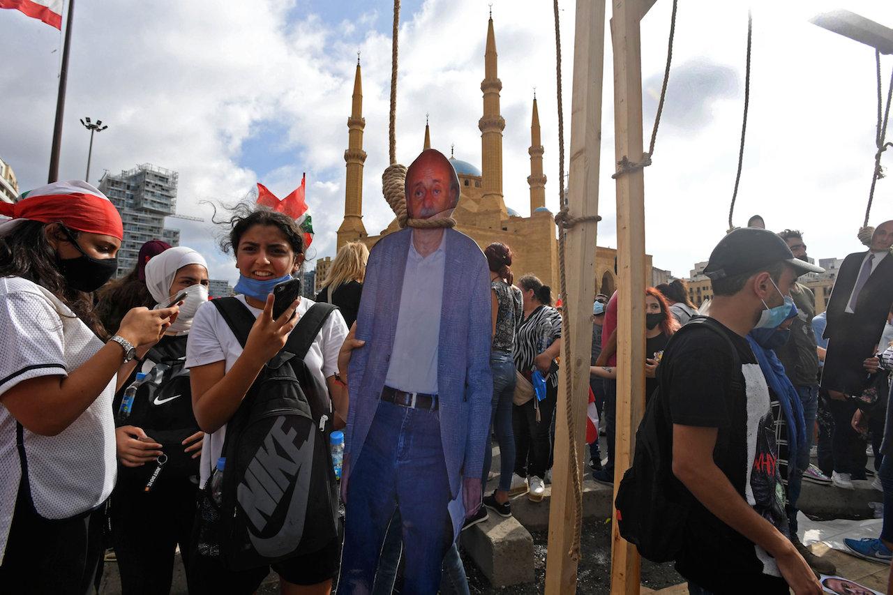 ด้านผู้ชุมนุมที่จัตุรัสมาร์เทอร์ ตั้งตะแลงแกงจำลองขึ้นมา แขวนหุ่นปลอมที่ติดใบหน้าของผู้นำทางการเมืองหลายคน รวมถึงอดีตนายกรัฐมนตรี ซาอัด ฮารีรี และนายฮัสซัน นาสรัลเลาะห์ หัวหน้ากลุ่มฮีซบอลเลาะห์ เอาไว้ แสดงถึงความโกรธเกรี้ยวที่พวกเขามีต่อรัฐบาลและกลุ่มติดอาวุธกลุ่มนี้ ตะแลงแกงดังกล่าวยังถูกตั้งในจุดเดียวกับที่ประชาชนจำนวนมากถูกแขวนคอเมื่อกว่า 100 ปีก่อน ฐานลุกฮือขึ้นต่อต้านจักรวรรดิออตโตมัน ด้วย