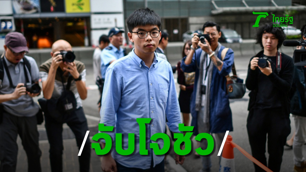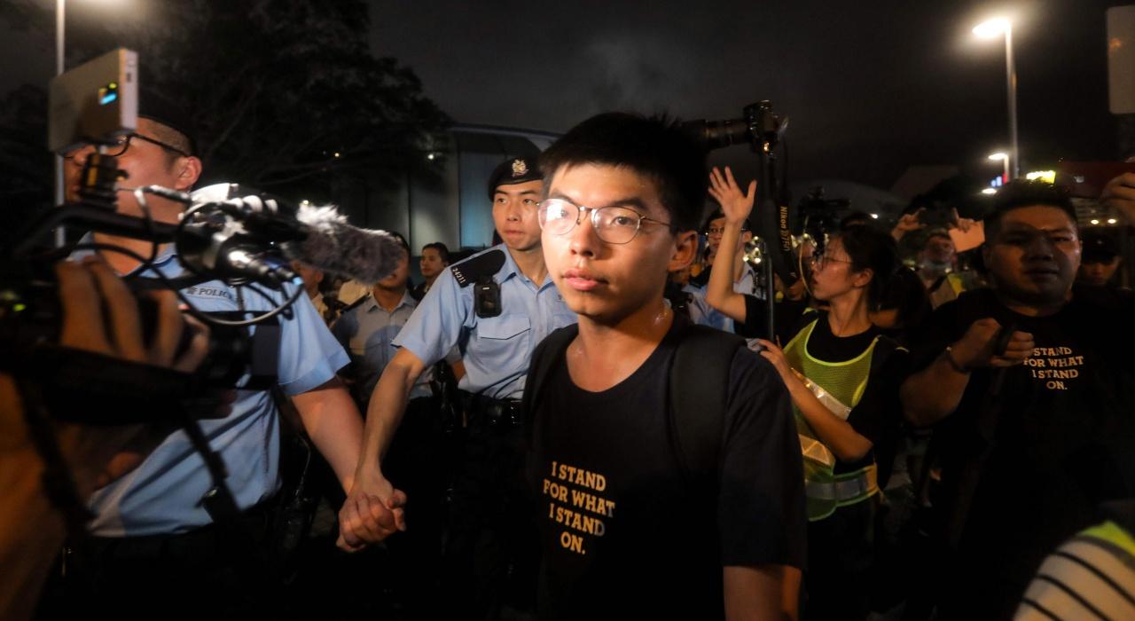 นายโจชัว หว่อง นักเคลื่อนไหวเพื่อประชาธิปไตยชาวฮ่องกง ถูกตำรวจจับกุมในขณะที่เข้าไปรายงานตัวที่สถานีตำรวจเซ็นทรัล ในข้อหาร่วมชุมนุมผิดกฎหมาย และละเมิดกฎหมายการห้ามสวมหน้ากากเมื่อปีที่แล้ว