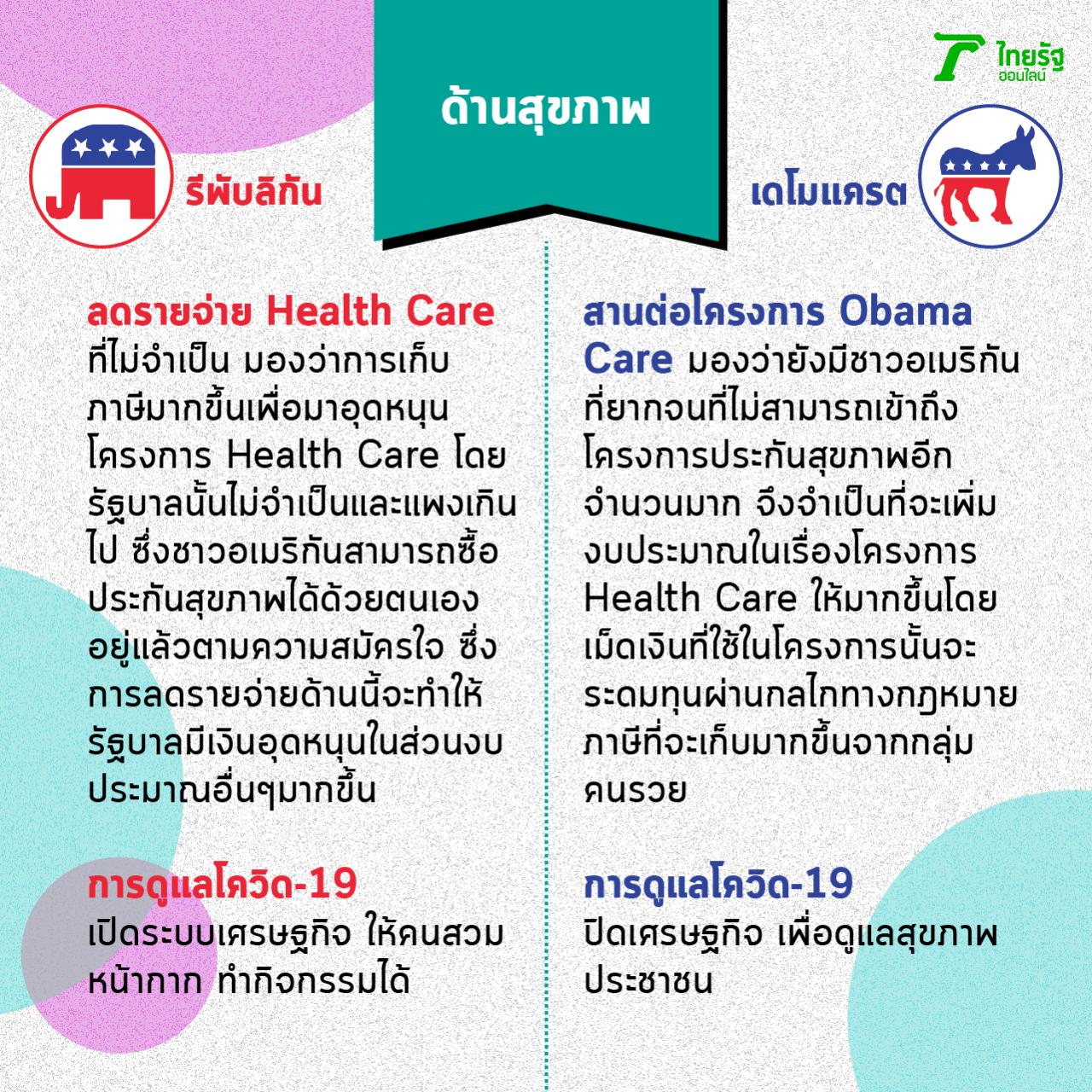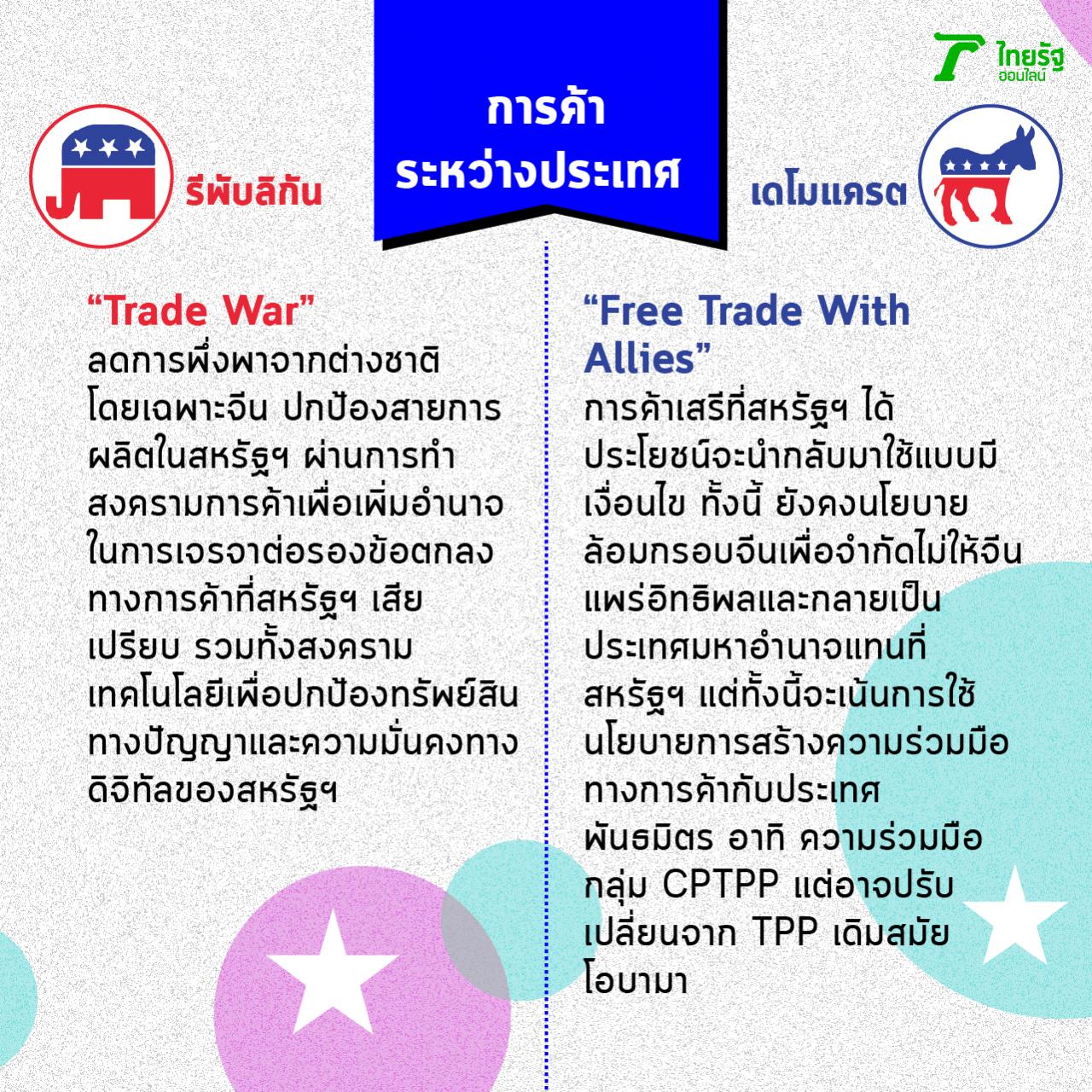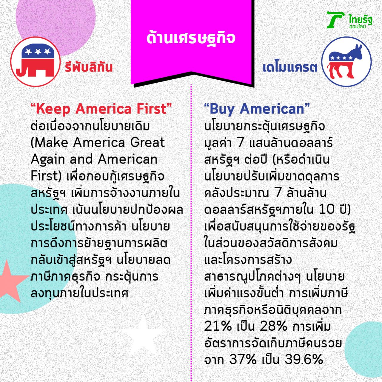 เริ่มแล้วการเลือกตั้งสหรัฐฯ อย่างเป็นทางการ เมื่อวันที่ 3 พ.ย.2563 และใครจะเป็นประธานาธิบดีสหรัฐฯ คนที่ 46 ระหว่าง โดนัลด์ ทรัมป์ แห่งพรรครีพับลิกัน กับ โจ ไบเดน แห่งพรรคเดโมแครต ซึ่งมีการวางยุทธศาสตร์สหรัฐฯ ต่อการวางตัวทางการเมืองและเศรษฐกิจโลก รวมถึงการวางตัวระหว่างสหรัฐฯกับจีน และจะมีผลต่ออนาคตเศรษฐกิจไทย เพราะทั้งทรัมป์และไบเดนมีมุมมอง และนโยบายแตกต่างกัน.